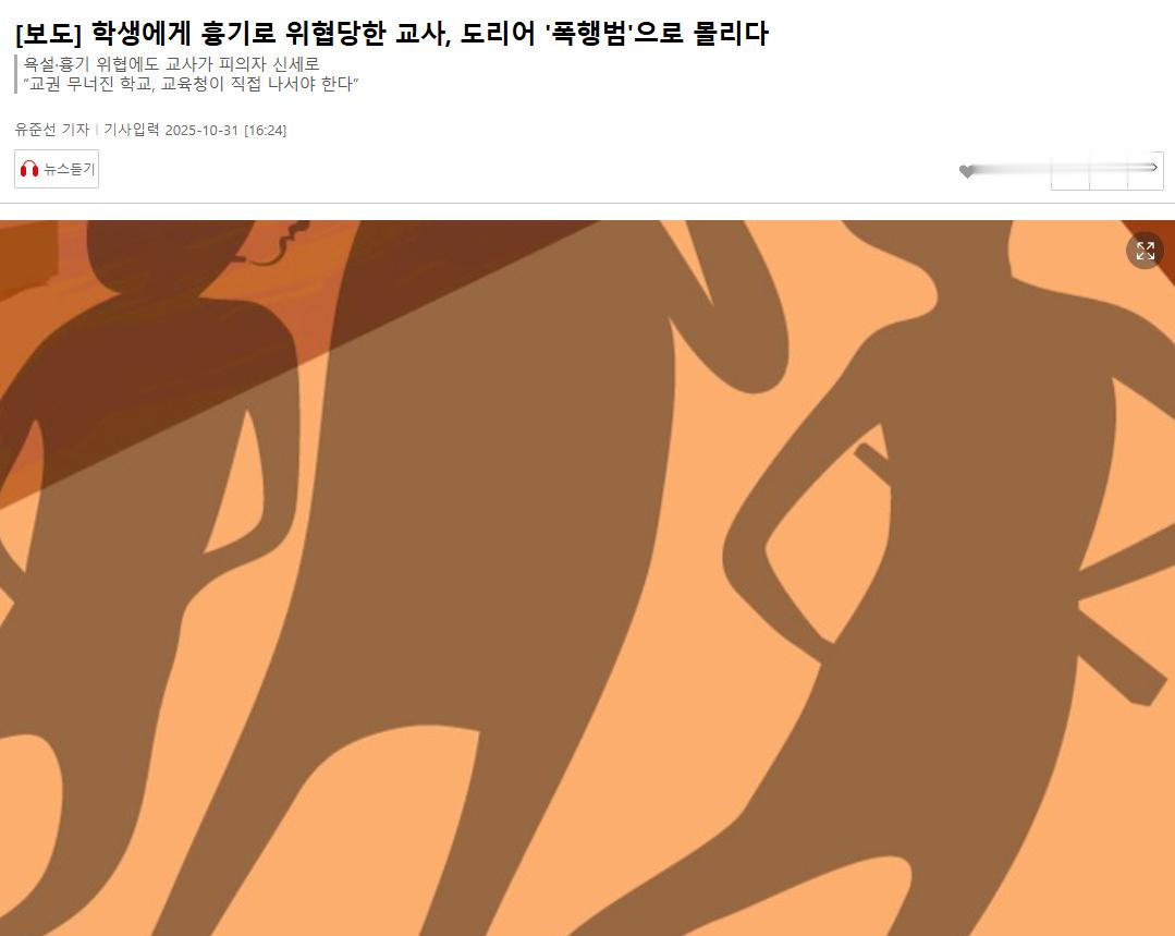 在首尔某中学发生了一起事件,一名女教师在午餐时间引导学生时遭到两名女学生的严重辱骂和持凶器威胁。受害教师因此事件正在接受精神科治疗,但却面临着被学生以"双方互殴"为由反告的噩梦般现实。