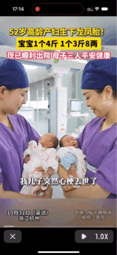 52岁高龄孕妇生下一对龙凤胎宝宝 母子3人平安健康。家属送锦旗感谢 浙江杭州临平的林女士以前有个幸福的家庭,可不幸的是几年前,他唯一的儿子因为心梗去世了。看着空荡荡的儿子的房间,她决心再生一个孩子。 林女士找到临平妇幼保健院的王医生咨询。王医生说:风险是有的,但也有可能成功呢?只要我们尽力,尽力而为,成功了更好,失败也不必难过 这番话让林女士增加了信心:我一定要生个孩子! 林女士已经51岁了,自然受孕成功的几率太小太小了。在王医生的指导帮助下,林女士决定采用试管婴儿的方案。 试管婴儿成功率,女性的年龄起着决定性的作用。35岁以下的成功率约为40%一60%。35岁以上成功率成倍下降。 特别特别幸运的是,林女士竟然一次性成功!应该是医生的技术和她的信心打动了上苍吧。居然成功地怀上了双胞胎,还是龙凤胎! 怀孕35周的时候,林女士的龙凤孩子就迫不及待地想来到世间。她的胎膜破了。 要说林女士啊,她的这次剖宫产手术风险极高。因为林女士属于极高龄产妇,怀的又是双胞胎,而且以前腹部还做过手术。手术中稍有不慎,极有可能造成无法挽回的局面。 医院立即安排医院多学科及时给林女士手术,虽然手术中也出现了危机。但最终母子母女3人都平安! 宝宝体重一个4斤,一个3.8斤。但由于早产,被送进了婴儿监护室。现在母子女3人都平安健康出院啦 女子本弱,为母则刚。林女士52岁高龄生子,为她的勇气点赞👍也为医生点赞👍