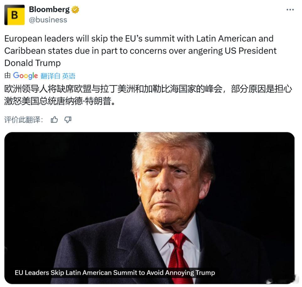 彭博社:欧洲领导人将缺席欧盟与拉丁美洲和加勒比国家的峰会,部分原因是担心激怒美国总统唐纳德·特朗普。