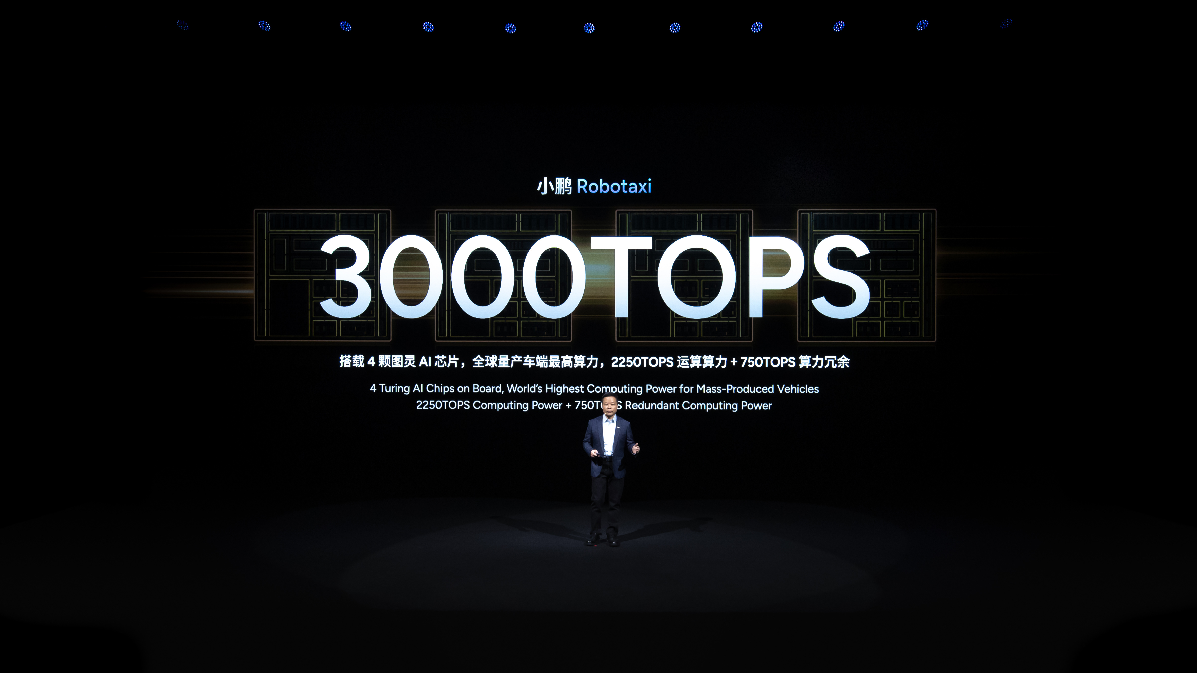 小鹏Robotaxi面向L4级智驾设计,在算力、转向、感知、能源、刹车、通讯六个系统上准备了2套冗余,搭载4颗图灵AI芯片,高达3000TOPS有效算力。