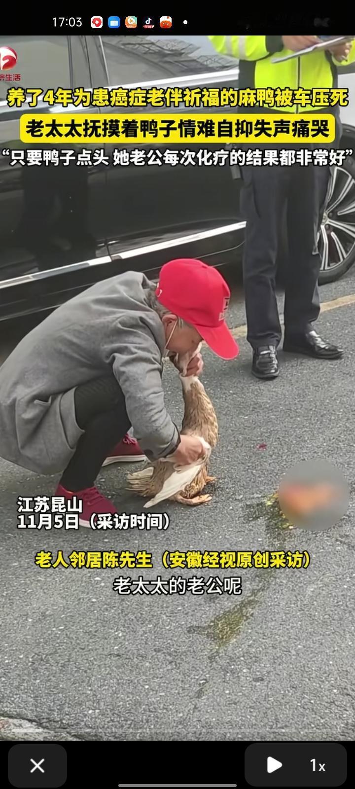 11月3日,苏州昆山市。网友发视频称,老人的老伴大概几年前得了癌症,估计是食道癌和胃癌,她养了鸭子是为了祈福老伴渡过难关。老人如果问鸭子“老头能不能回来”,鸭子很郑重的给她点点头。只要鸭子点头,老伴每次化疗结果都非常好。现在,这只鸭子被车压死了,老人抚摸着鸭子失声痛哭。 目前,交警已经找到肇事车主,正在协商赔偿。