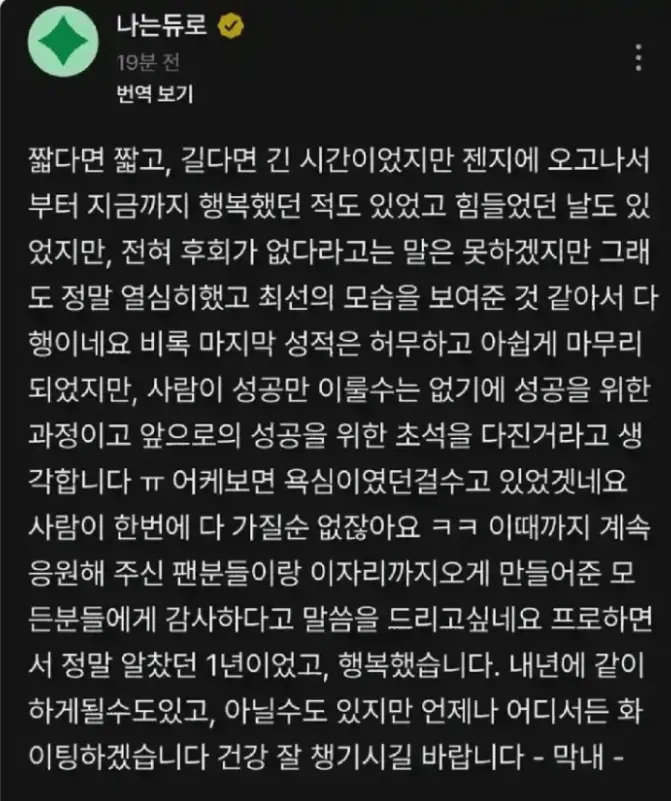 GEN辅助Duro今日在官方平台发文:这是一段说短不短、说长不长的时光,自从加入GEN后,有过幸福的时刻,也有过艰难的时刻。虽然不能说完全没有遗憾,但庆幸的是我真的非常努力了,竭尽全力展现了最好的面貌。明年可能还在一起并肩作战,也可能不在,但无论在哪里我都会一直加油的,希望大家身体健康。