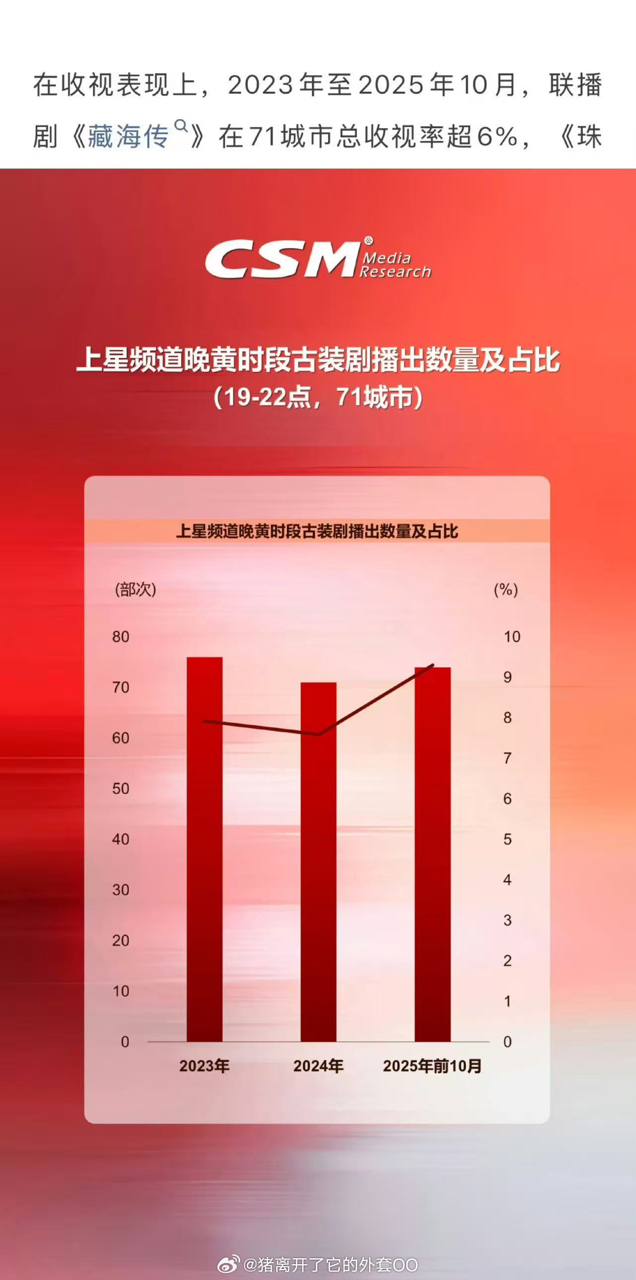 肖战藏海传好🐮,上星频道晚黄金时段古装收视中,2023年至2025年10月,联播剧《藏海传》在71城市总收视率超6%,在全媒体平台展现出卓越的传播效力,实现了热度与口碑的双重突破。2025年1月至10月,其全媒体触达人次超250亿,全媒体视听总时长近1300亿分钟,大小屏用户各占半壁江山,好棒🎉