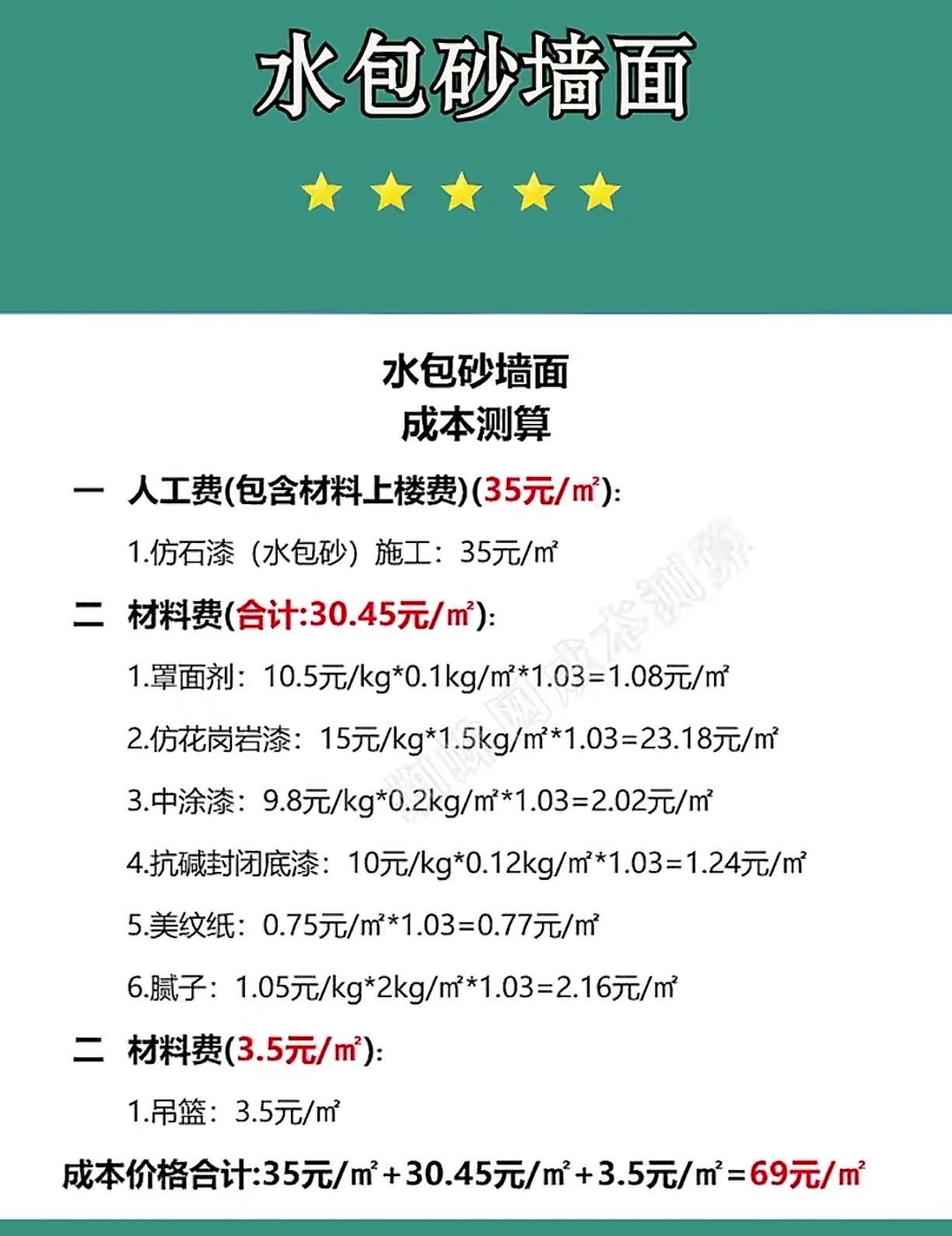 家人们,水包砂墙面看着高级,但这里面的坑可不少,今天就给你们扒扒怎么避坑! 首先看人工费,35块包含材料上楼,得在合同里写清楚“上楼到哪一层”,别等施工时师傅说只到一楼,高层搬运费又得加钱! 材料费这块猫腻多:仿花岗岩漆写着1.5kg/m²,实际施工时得盯着桶,有些队会偷偷掺稀释剂,看着量够,其实浓度不够,后期容易掉漆!中涂漆和抗碱底漆也得盯,别用过期的,打开闻着有酸味的直接拒收! 吊篮费3.5元/m²,得问清楚“包含安装拆卸吗?”,别后期又加钱!还有腻子,2kg/m²别少秤,不然墙面容易开裂。 最关键的是验收:完工后先看整体颜色匀不匀,有没有发花;再用手摸,不掉粉才合格;最后泼水测试,罩面剂靠谱的话,水会成珠滚落,渗得快的就是偷工减料了! 记住,付款别一次性结清,留20%尾款,过了雨季没问题再给,不然出问题都找不到人!你们家做水包砂踩过坑吗?评论区说说!