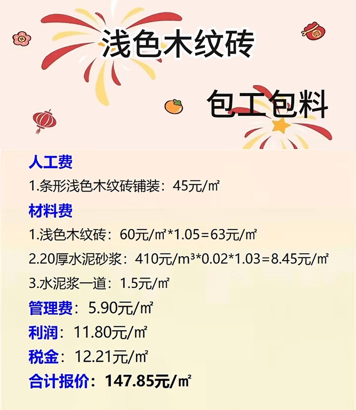 家人们,贴浅色木纹砖可别光看报价低就冲!今天给你们扒扒这147.85元/㎡背后的坑,一不小心就多花冤枉钱! 首先看人工费45元/㎡,这钱得盯紧师傅手艺——铺木纹砖得对缝吧?高低差不能超过1毫米,不然踩上去硌脚还积灰。要是师傅图快,砖缝对不齐、砂浆铺得薄,用不了半年准空鼓! 再看材料费,猫腻最多!木纹砖60元/㎡,但报价里加了5%损耗(1.05倍),这是合理的,但得亲眼看着师傅拆箱,别让他们用碎砖凑数,尤其是浅色砖,一点瑕疵都特明显!20厚水泥砂浆8.45元/㎡,得问清楚用的是32.5还是42.5水泥,标号不够容易起砂,后期拖地全是灰! 还有管理费、利润这些,加起来快20元/㎡了,签合同前必须让他们列明细——是不是包含补货运费?空鼓了包不包返工?别交了钱就翻脸不认账! 最后记好避坑招:①看样品砖泡水24小时,不掉色、不发白才合格;②铺的时候现场盯,砖缝用卡子固定,砂浆厚度够不够用尺子量;③付款留30%尾款,干透了检查没问题再给。 别觉得麻烦,这钱花在明处,住着才踏实!你们家铺木纹砖踩过啥坑?评论区避雷啊!