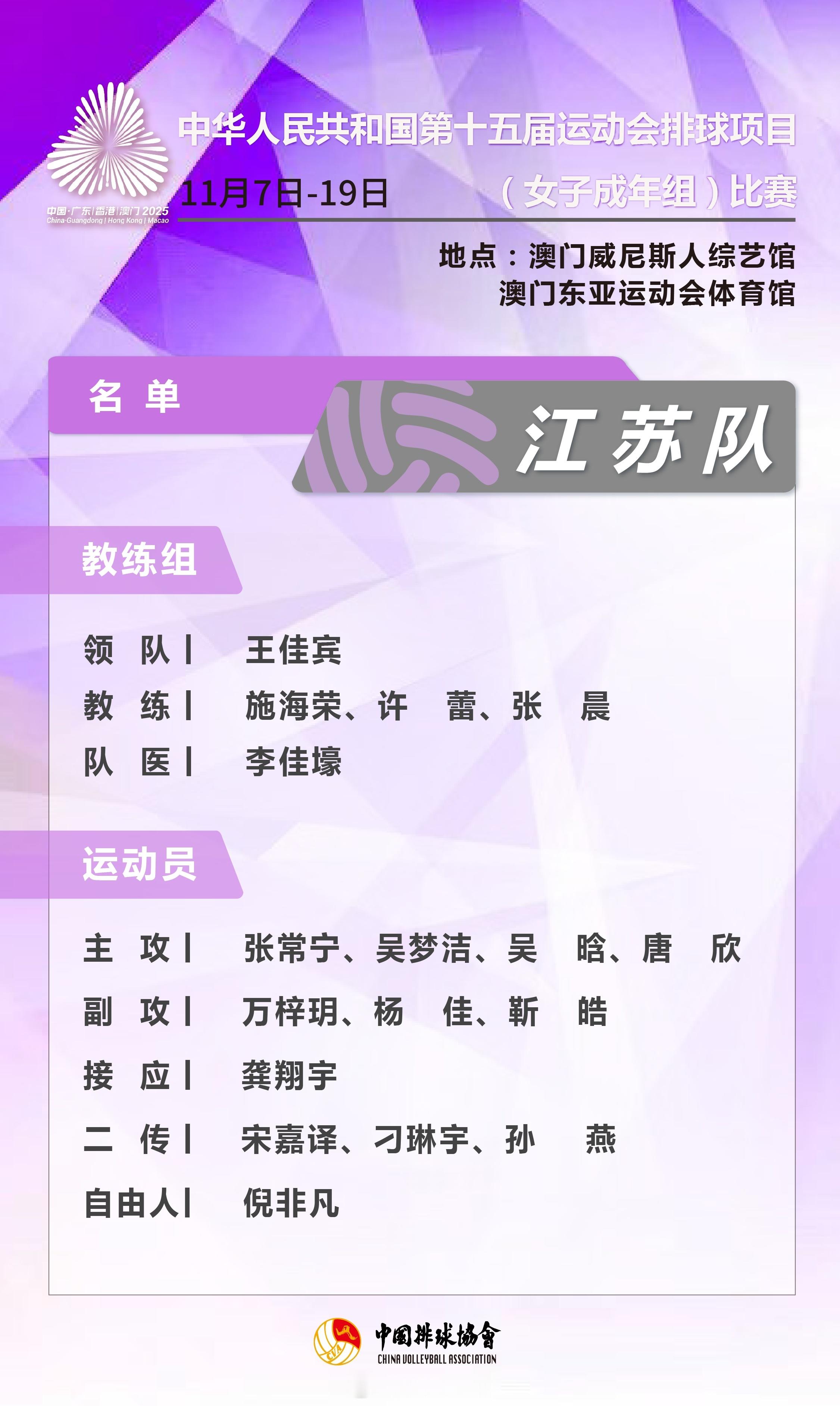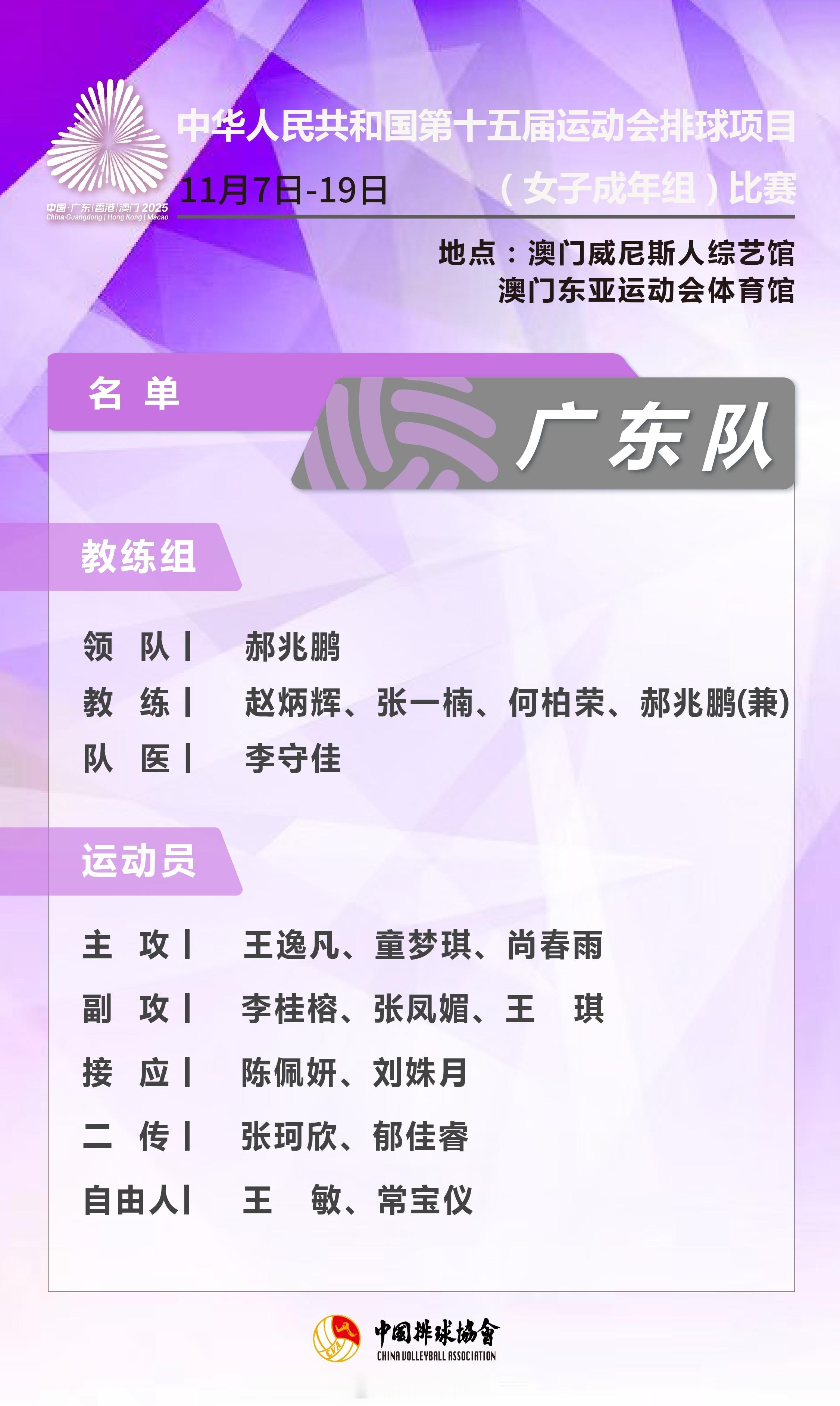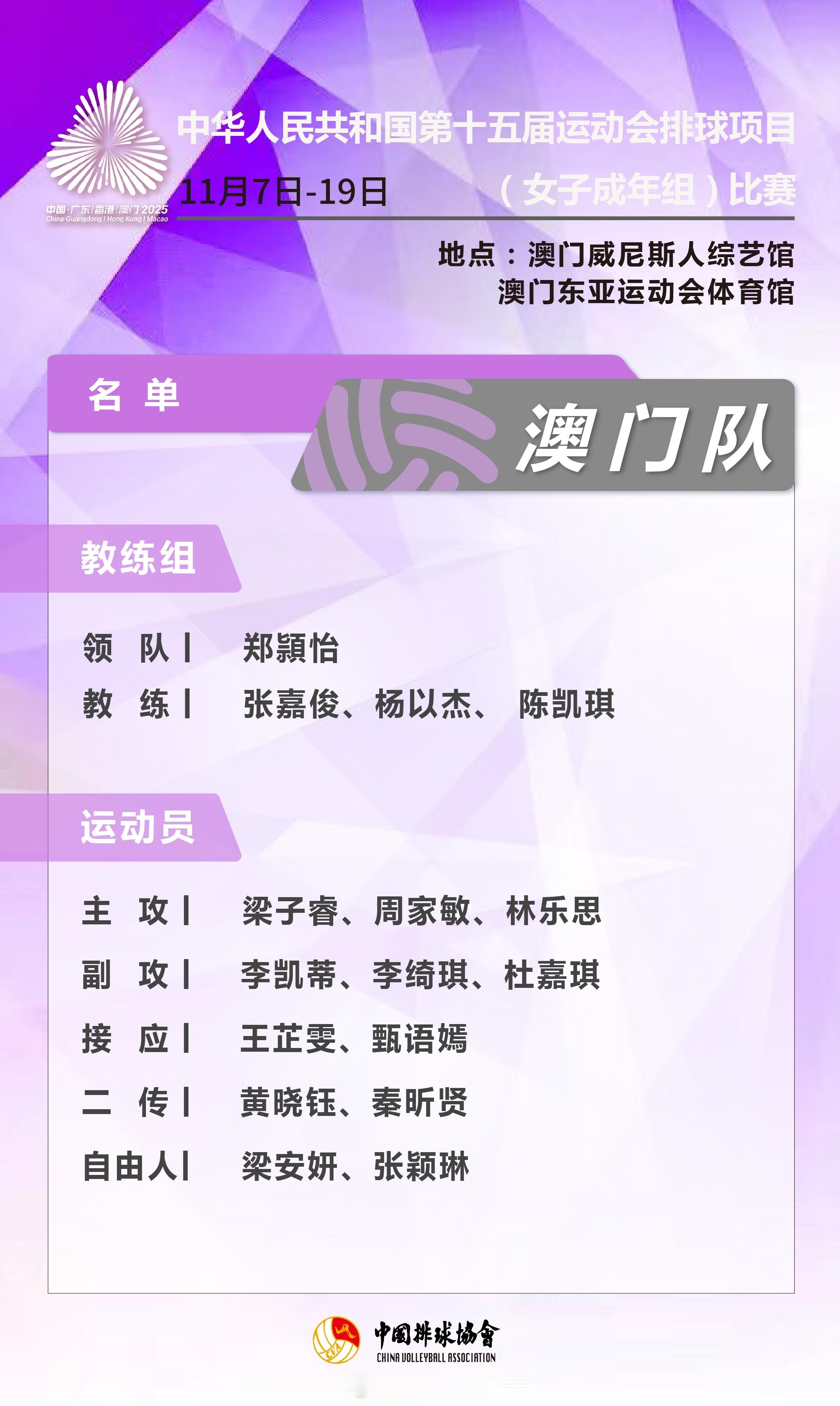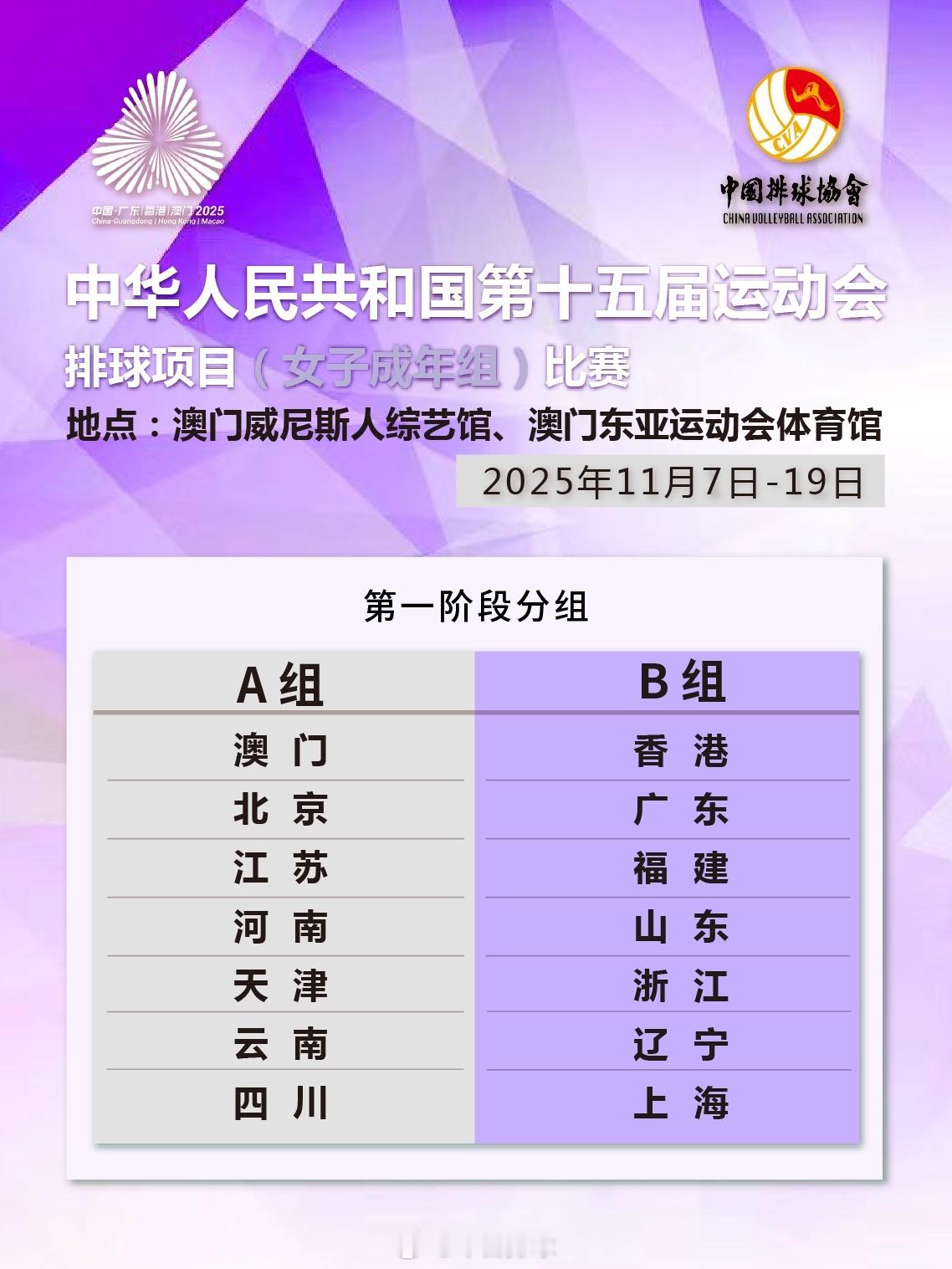 2025年(大湾区)第十五届全运会 排球项目女子成年组决赛阶段的比赛11月7~19日在澳门举行,赛事在澳门威尼斯人综艺馆和澳门东亚运动会体育馆展开。共有包括东道主广东、香港、澳门的14支球队参赛,先分成A、B两个小组进行单循环赛,小组赛前四名进行交叉四分之一决赛,随后进行半决赛、决赛。小组赛后三名进行9~14名的排位赛。分组形势、完全赛程,和各参赛队运动员、教练员名单见附图(中国排协)。央视频、央视体育APP全程直播,部分受关注场次在电视频道同时直播。