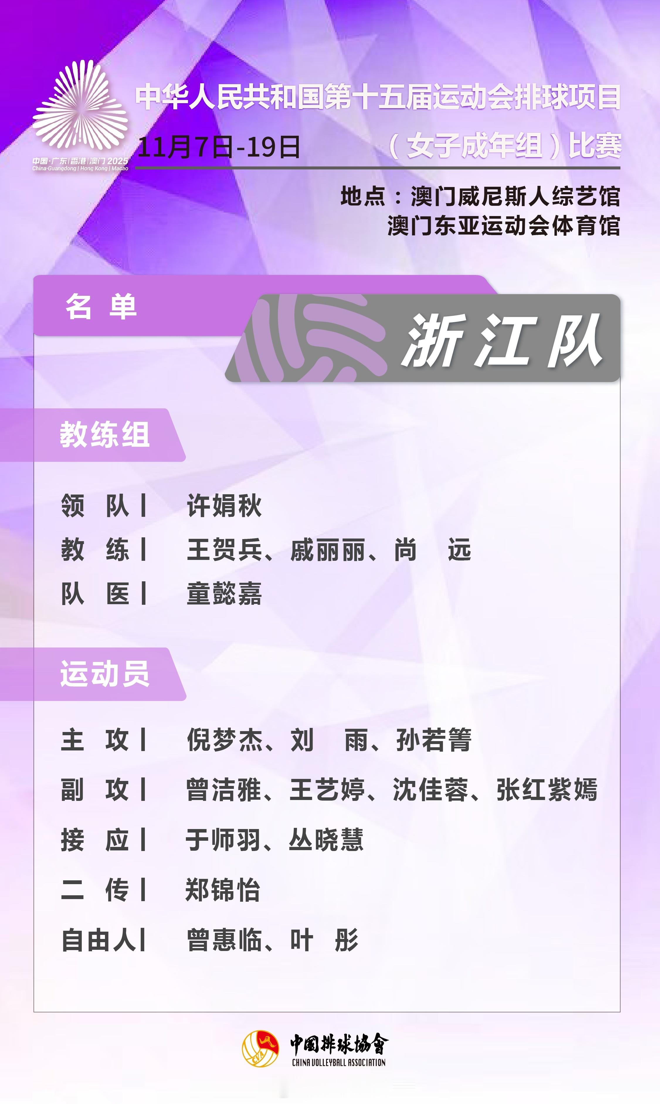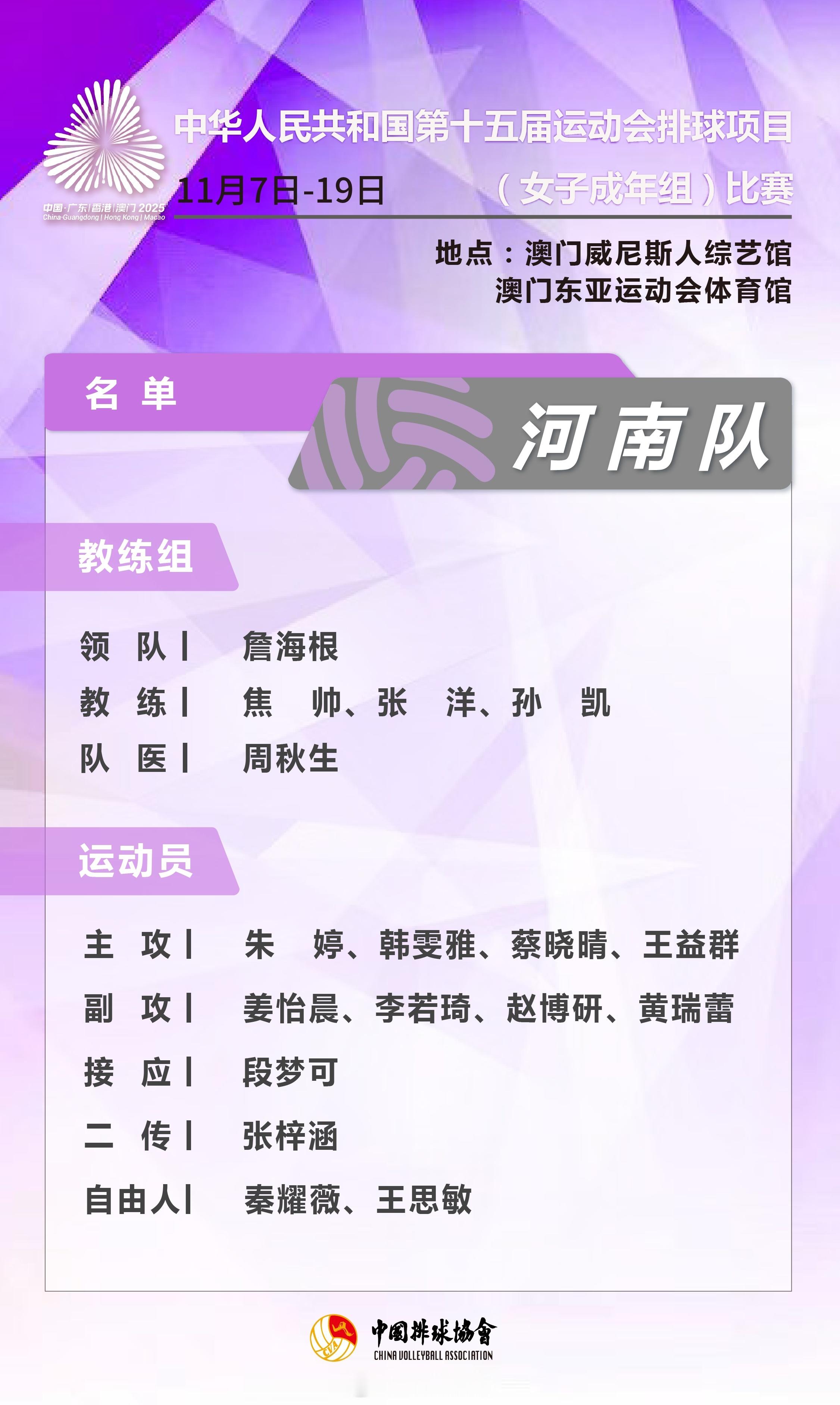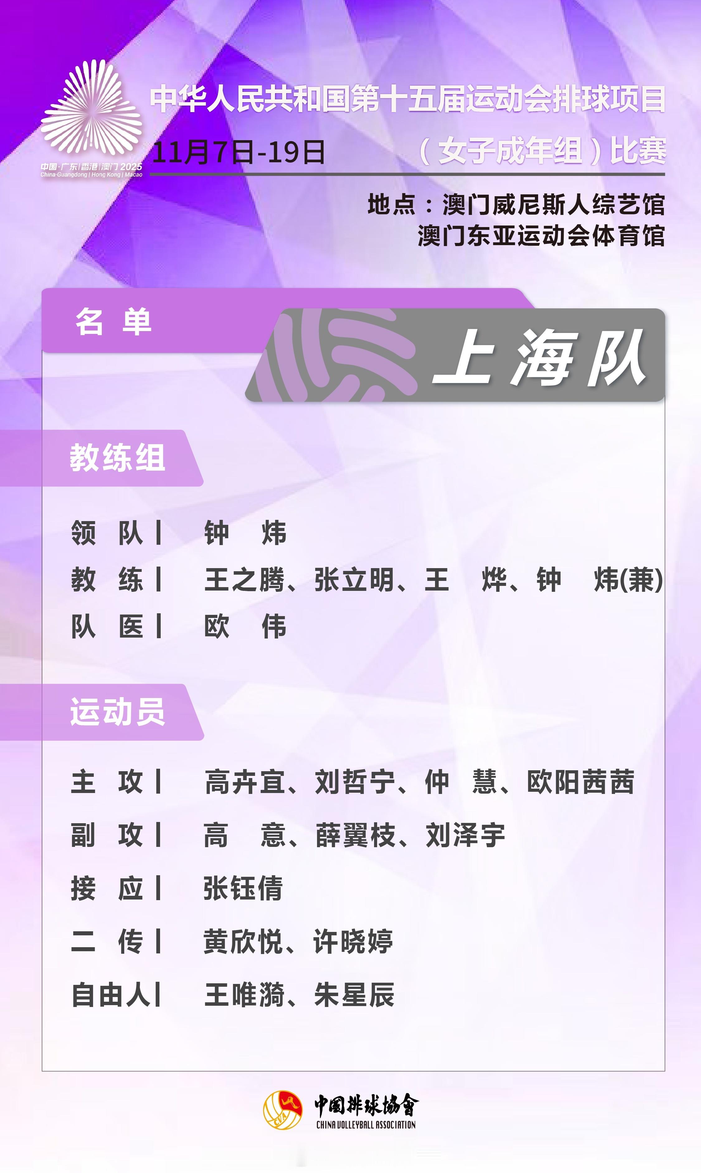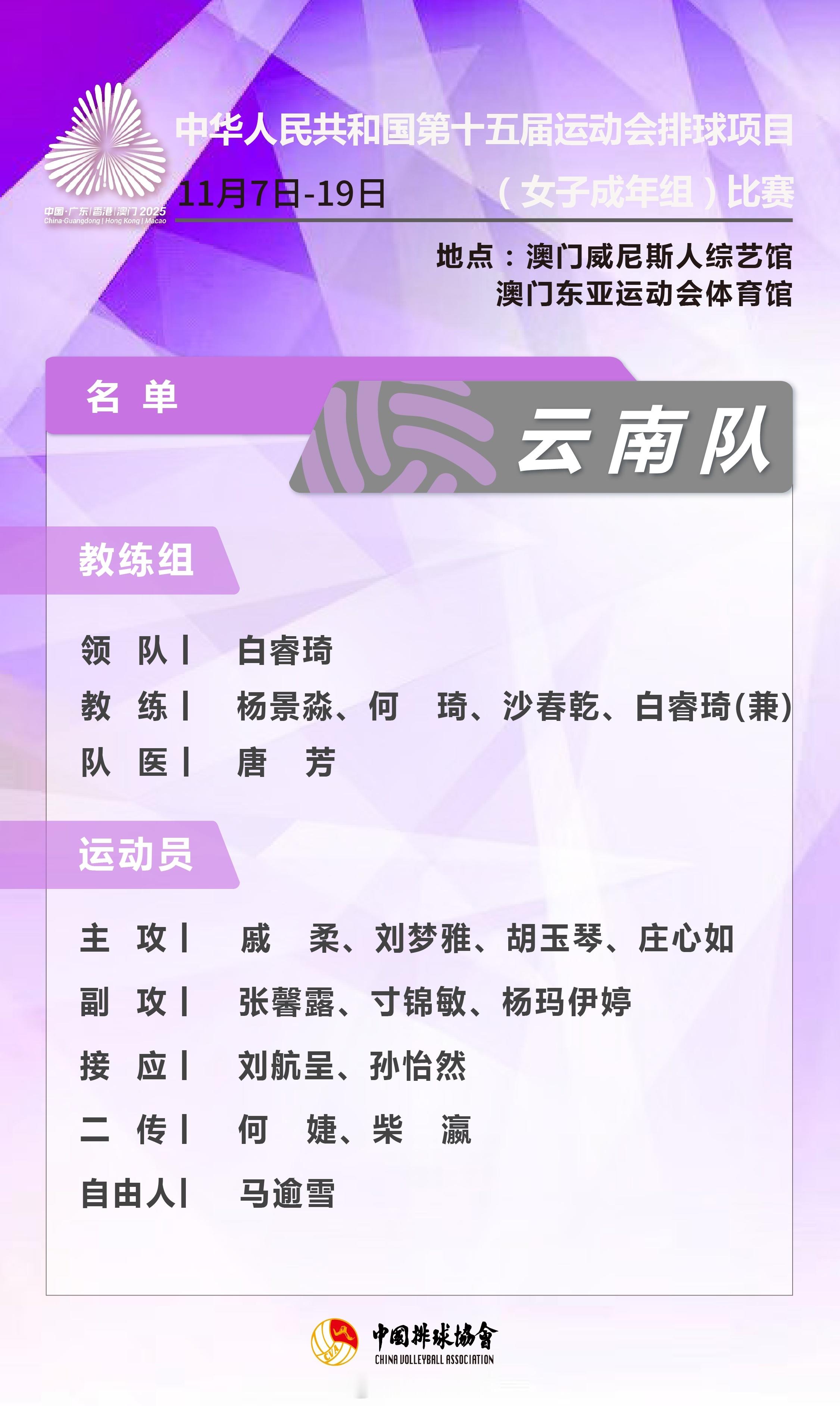 2025年(大湾区)第十五届全运会 排球项目女子成年组决赛阶段的比赛11月7~19日在澳门举行,赛事在澳门威尼斯人综艺馆和澳门东亚运动会体育馆展开。共有包括东道主广东、香港、澳门的14支球队参赛,先分成A、B两个小组进行单循环赛,小组赛前四名进行交叉四分之一决赛,随后进行半决赛、决赛。小组赛后三名进行9~14名的排位赛。分组形势、完全赛程,和各参赛队运动员、教练员名单见附图(中国排协)。央视频、央视体育APP全程直播,部分受关注场次在电视频道同时直播。