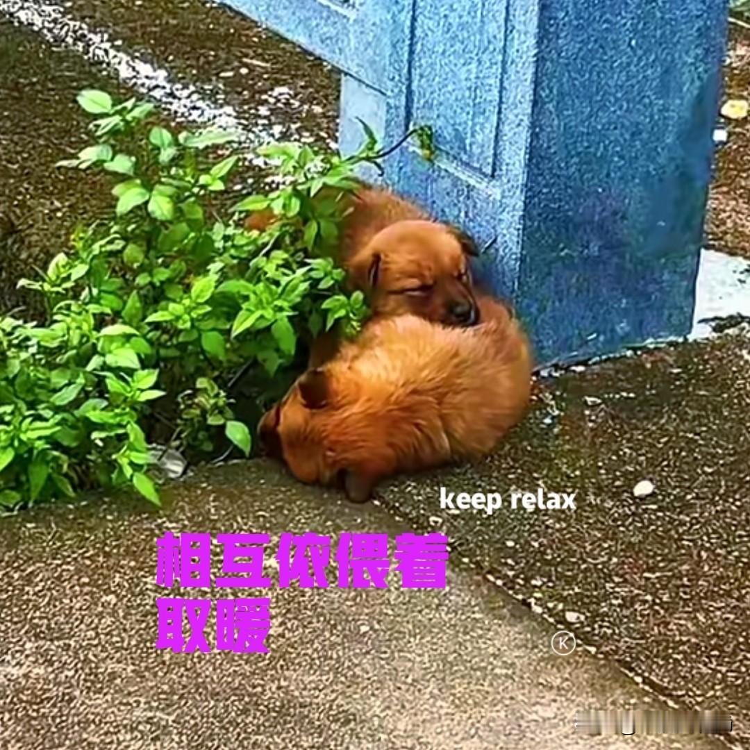早上在河边散步的时候,发现石栏下面躺着两只小狗。小狗睡得很香,它们紧紧地依偎在一