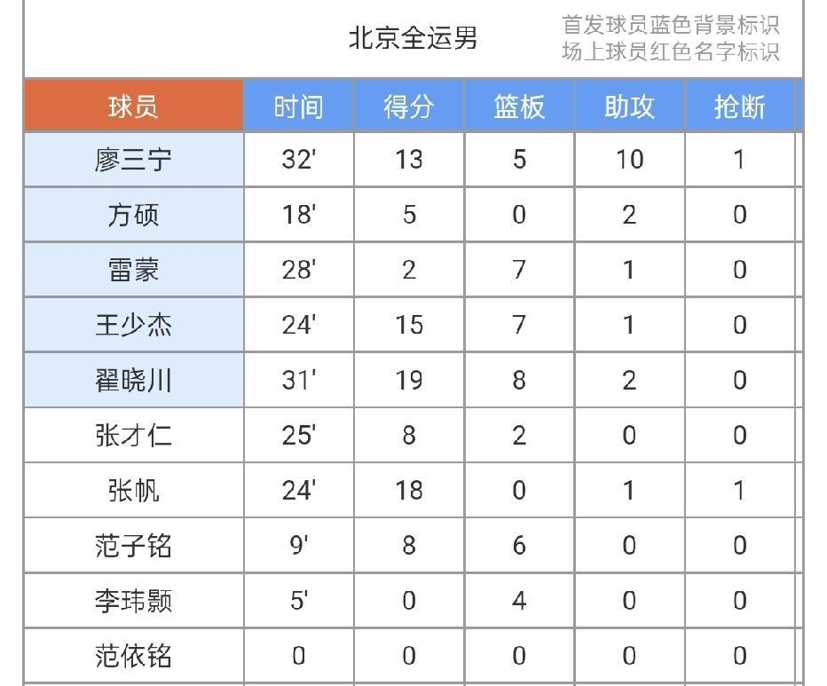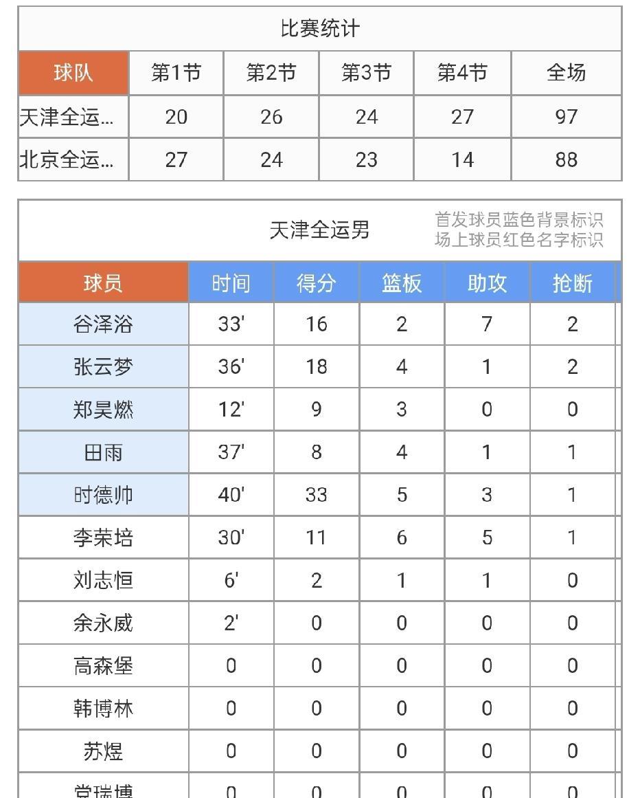 全运会男篮比赛第一场冷门。北京男篮以88:97不敌天津男篮,无缘开门红。天津赢了北京之后已经2连胜,后面还要打吉林和辽宁,考虑到吉林男篮不是很强,目前基本确定天津能够晋级了晋级8强。全场数据统计看天津只有3次失误,北京11次失误,篮板天津25个,北京39个。其他数据都差不多。 北京虽然由北京首钢和北控男篮两家部分球员组队,但是受到伤病困扰,邹雨辰和邱天等人因伤没有参加本场比赛。天津今天主要赢在时德帅身上,打满全场一人砍下33分5篮板3助攻1抢断。 #北京男篮# #全运会男篮# #天津男篮#