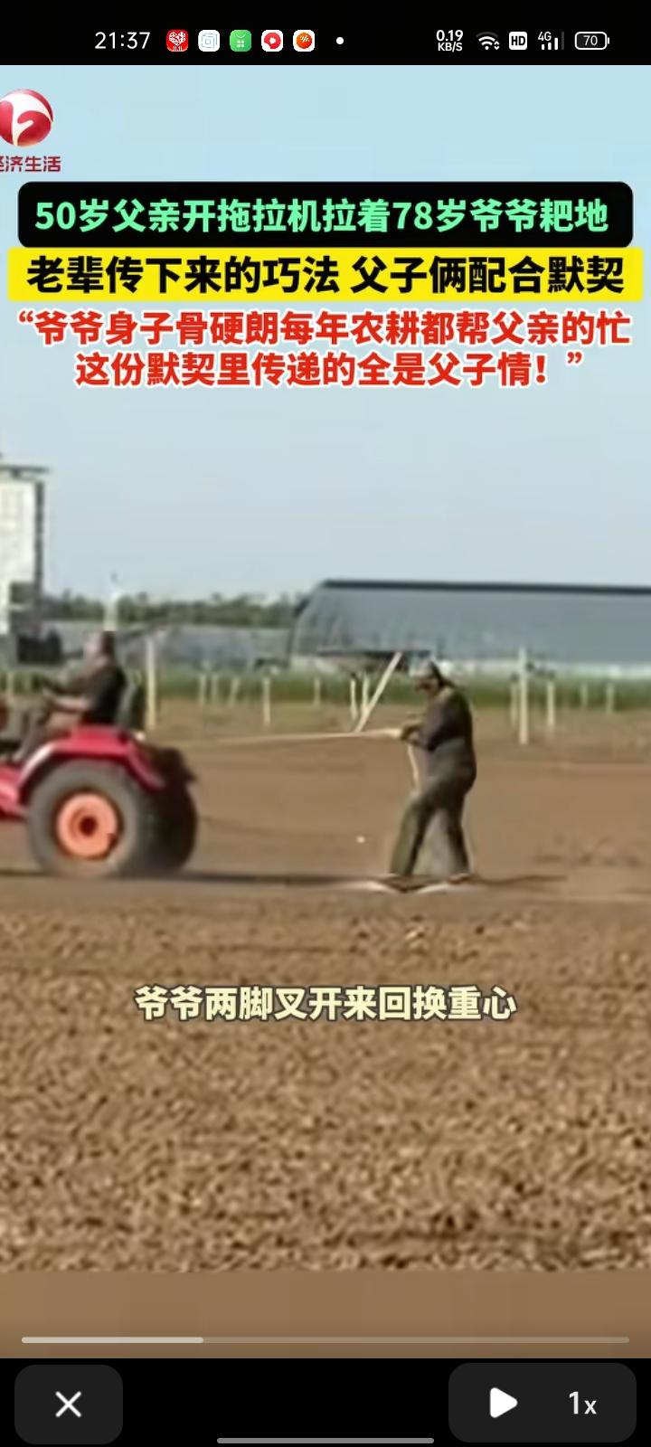 11月1日,河北石家庄。女子发视频表示,50岁父亲开着拖拉机拉着70岁爷爷耙地,爷爷两脚叉开来回换中心,带动耙子左右扭,把地耙的平平整整,这是老辈人传下来的种地巧法,在这里传了好几代人,也延续了家人情谊。爷爷身子骨硬朗,每年农耕帮父亲的忙,这份默契里传递的全是父子情。