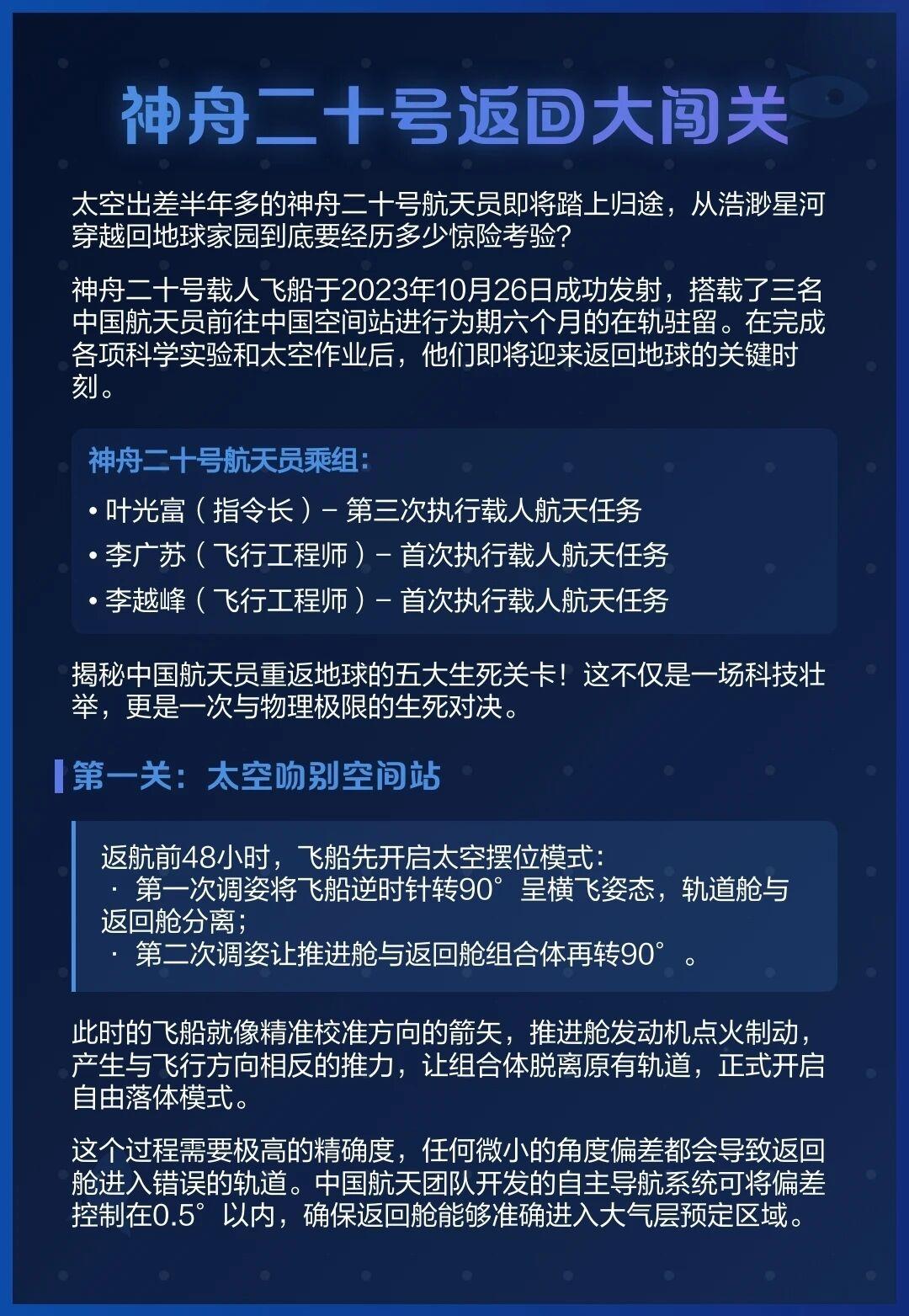 神舟二十号延迟返回:太空碎片正在改变人类的航天方式 (2025-11-5 17:58) 中国载人航天工程办公室于今日发布通告,宣布神舟二十号任务的返回计划推迟。此次延迟的原因并非天气或着陆场条件,而是飞船疑似遭遇微小轨道碎片的撞击,导致返回时机需要重新评估。任务团队正积极进行影响分析和舱体状态的全面评估,以确保航天员的安全和飞船的完整。 近年来,随着人类航天活动的不断增加,轨道碎片问题日益凸显。太空碎片包括废弃的卫星、火箭残骸以及其他航天器残片,这些微小物体在高速运动中对航天器构成潜在威胁。神舟二十号此次遇到的轨道碎片事件,提醒我们:太空环境正经历着前所未有的变化,也在深刻影响着未来的航天方式。 专家指出,轨道碎片的增加不仅增加了航天器的碰撞风险,也促使航天机构不断优化轨道监测、碎片规避技术和应急应对措施。未来,航天任务将更加注重碎片风险评估和轨道环境的动态监控,甚至可能推动“太空碎片清除”技术的发展,以保障航天员和航天器的安全。 中国作为航天大国,一贯高度重视航天安全和可持续发展。此次神舟二十号的事件,反映出我们对航天环境复杂性的认识不断深化,也激励我们加快研发更先进的碎片监测与规避技术。相信随着科技的不断进步,人类将能更好地应对太空碎片带来的挑战,实现更加安全、可持续的太空探索。 总的来看,太空碎片的出现,虽然带来了新的挑战,但也促使全球航天界重新审视航天安全和环境保护的责任。未来,我们期待在科技创新的推动下,航天活动能更安全、更绿色,为人类探索宇宙开辟更加广阔的空间。神州二十飞船 神州二十延迟返回
