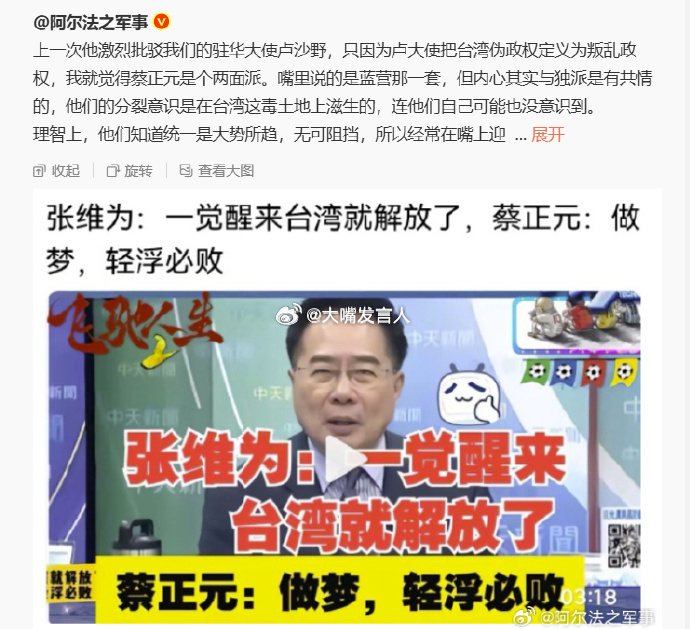 去年我们驻法国的卢大使,说了一句,“目前的(2024年6月26日)湾湾政权是叛乱政权”(图5),搞得某些非绿分子都破防了,公开骂卢大使,公开叫嚣让PLA打过来(图3图4),专家还反对张维为等学者谈武统(图6),但他自己可以讲武统时蛙军多稀菜(图7)
