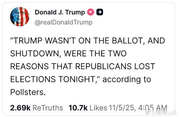 特朗普承认共和党在选举中失败。他解释说:“我没参选,而且政府停摆也是原因之一。”