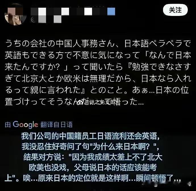 万万没想到,日本在中国的定位居然是这样的,日本网友吐槽。 其实我有很多认识的人也去了日本,他们都说日本的生活环境比中国好多了。但是很惭愧我还没去过。 这位日本网友在网上诉说,他们公司的中国员工日语很流利,而且也会英语,在好奇心的驱使下,询问了对方为什么来到日本。 结果只有一位中国同事说“因为自己成绩太差,上不了北大,欧美也没机会,父母说日本的话应该可以考” 也就是说日本是个……。