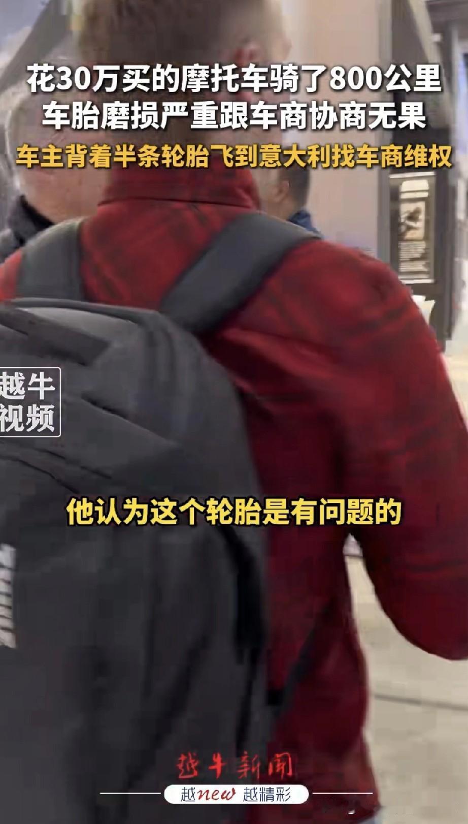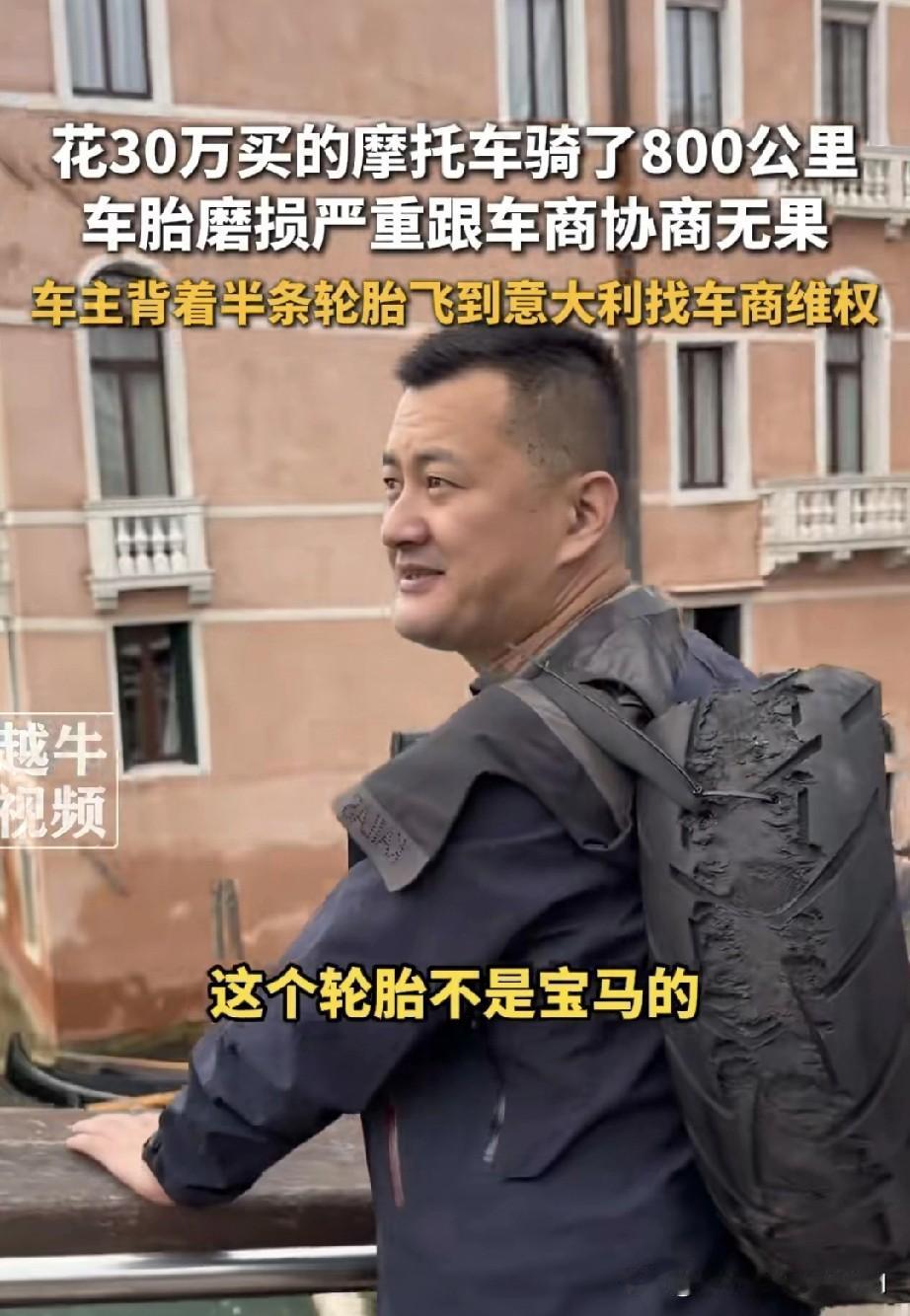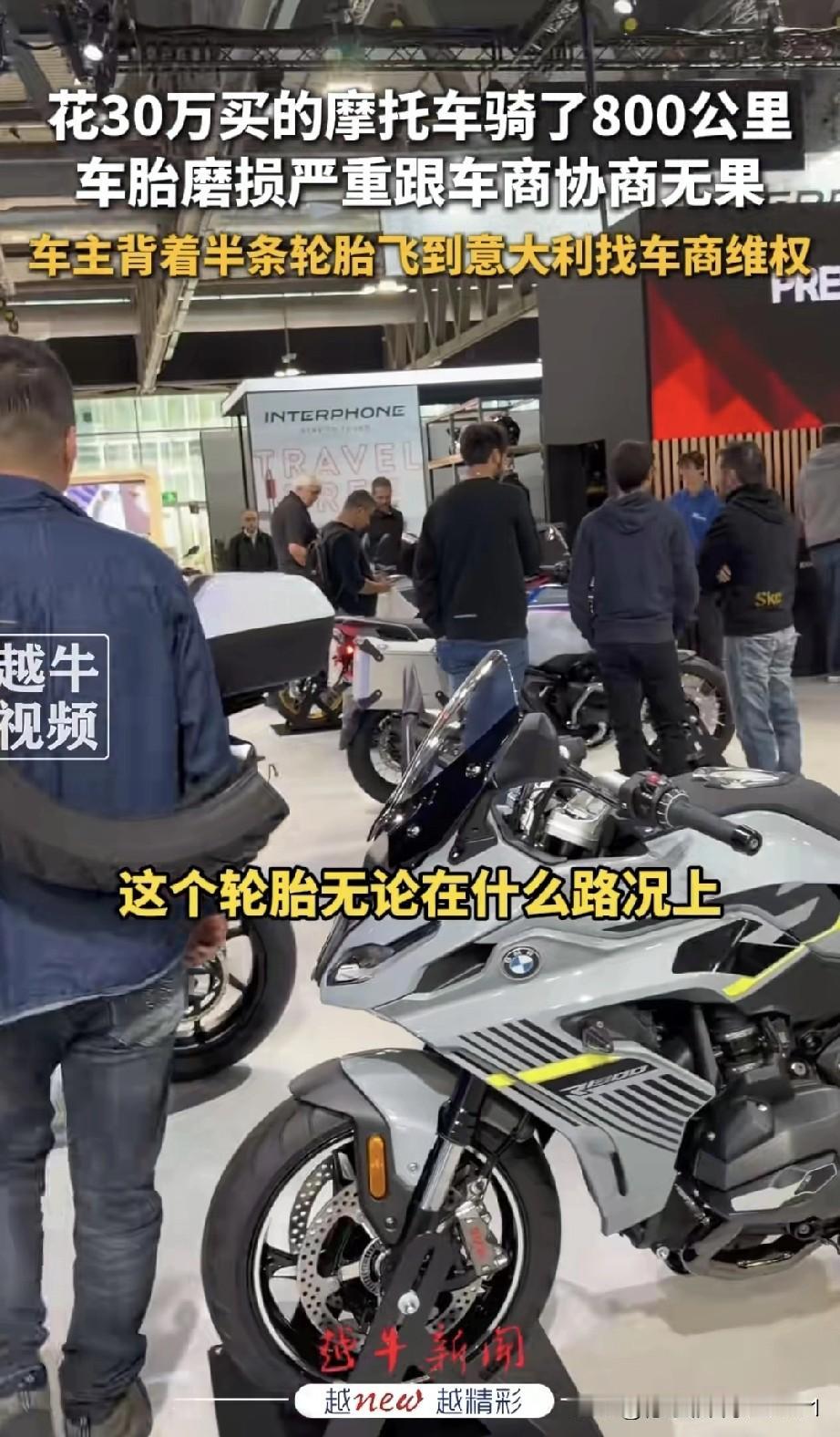 男子硬核维权,花30元购得的德国宝马摩托车骑行800公里后,车胎异常磨损严重。他找车商维权,车商收回轮胎鉴定,却一拖再拖。两个月过去,既无结果,也无回应。 男子一气之下,背着半条轮胎买机票赶赴意大利米兰国际摩托车展维权讨说法。德国宝马工作人员称,该轮胎无论在何种路面行驶,都不应出现这种问题。意大利宝马负责人告知男子,此轮胎并非宝马生产,即他们只造车,不生产轮胎,也就是说轮胎出事与他们无关,这锅甩得一干二净。照此说法,那也就只剩品牌是他们的了。 德国宝马应接手此事,调查国内经销商究竟哪里出了问题,如此才对得起德国品质在世界人民心中的形象。