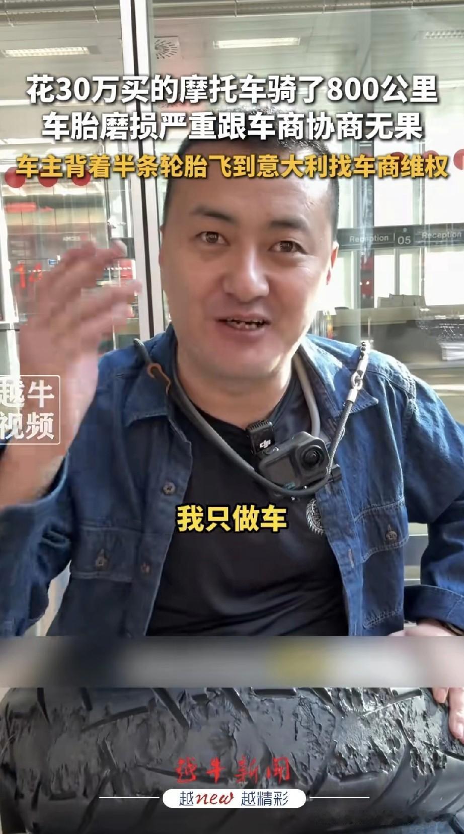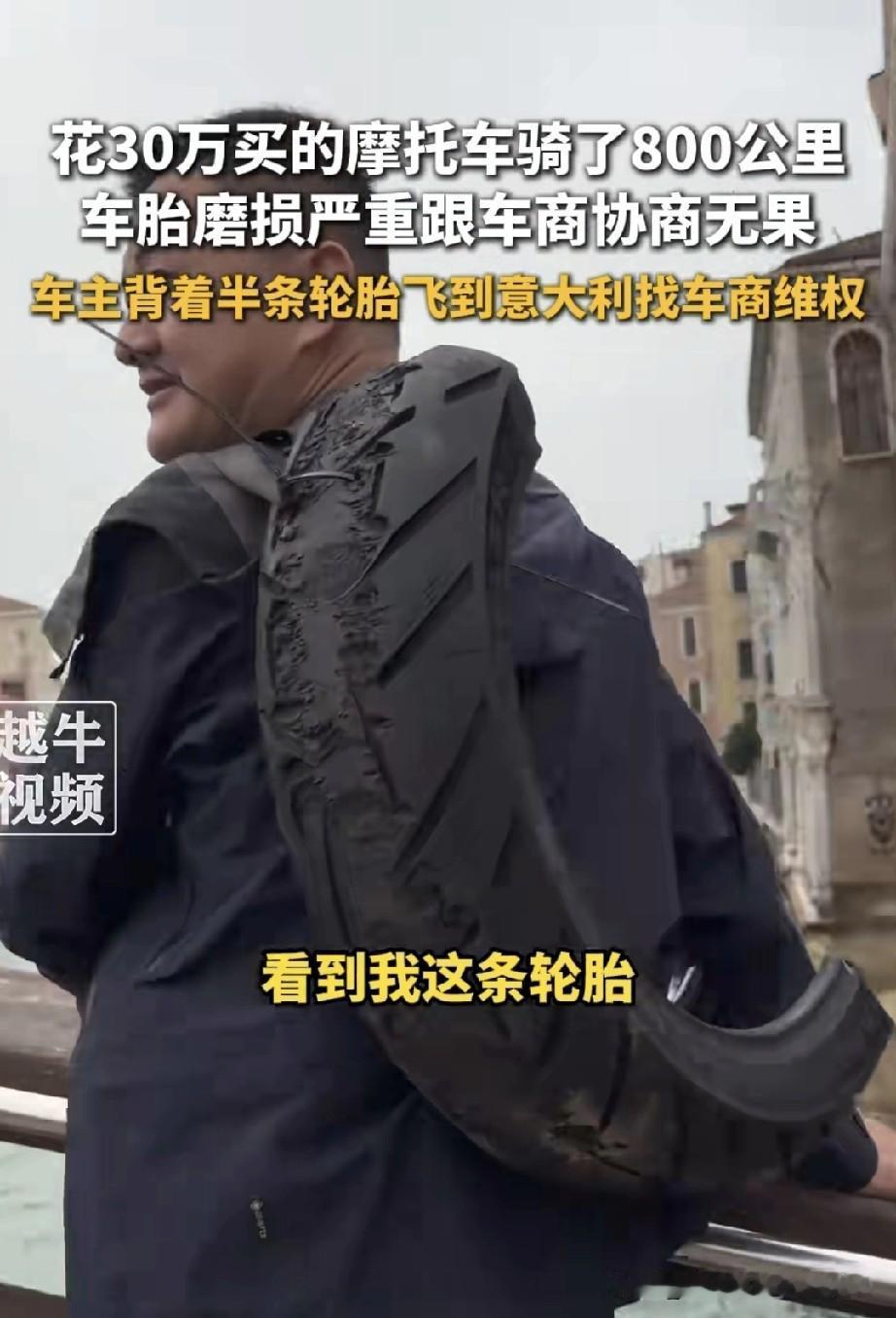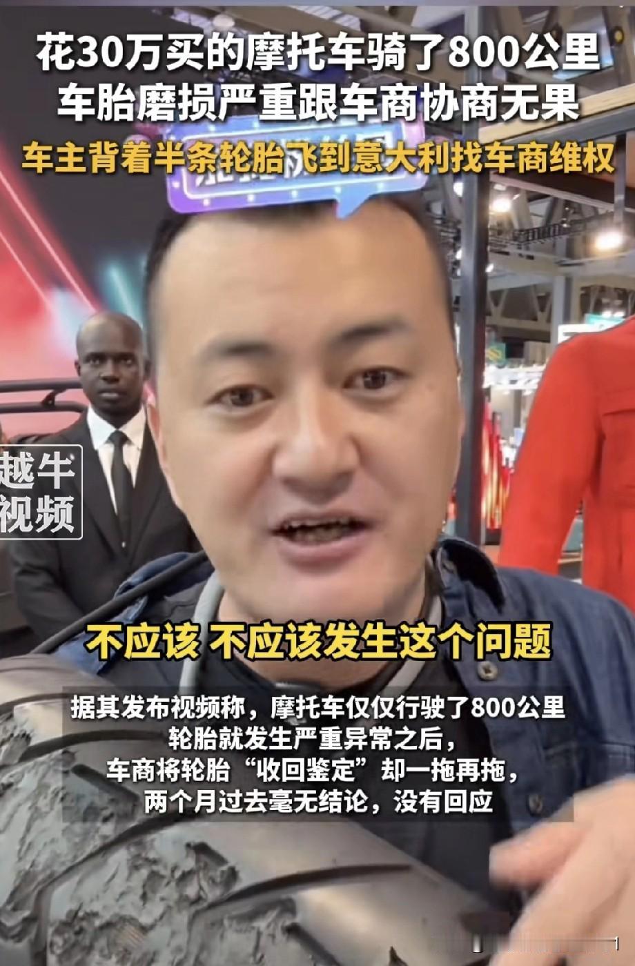 男子硬核维权,花30元购得的德国宝马摩托车骑行800公里后,车胎异常磨损严重。他找车商维权,车商收回轮胎鉴定,却一拖再拖。两个月过去,既无结果,也无回应。 男子一气之下,背着半条轮胎买机票赶赴意大利米兰国际摩托车展维权讨说法。德国宝马工作人员称,该轮胎无论在何种路面行驶,都不应出现这种问题。意大利宝马负责人告知男子,此轮胎并非宝马生产,即他们只造车,不生产轮胎,也就是说轮胎出事与他们无关,这锅甩得一干二净。照此说法,那也就只剩品牌是他们的了。 德国宝马应接手此事,调查国内经销商究竟哪里出了问题,如此才对得起德国品质在世界人民心中的形象。