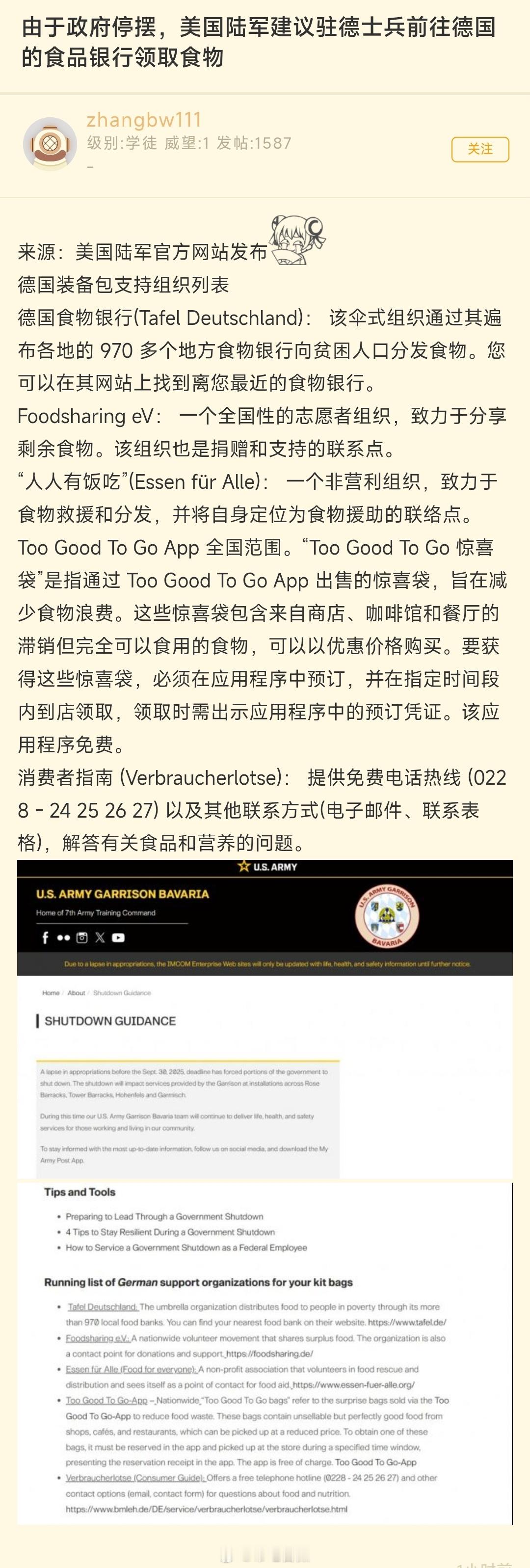 由于联邦政府停摆,美国陆军建议驻德士兵前往德国的食品银行领取食物。