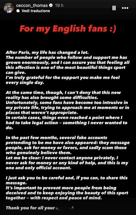 🇮🇹托马斯·切孔 (Thomas Ceccon) 在巴黎奥运会上表现出色数月后,他的名气和关注度不断提高,他向他的追随者发出了公开警告,警告冒充他的虚假账户和网络诈骗的风险。