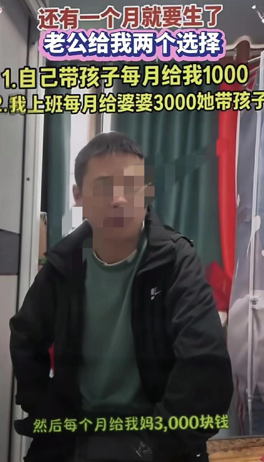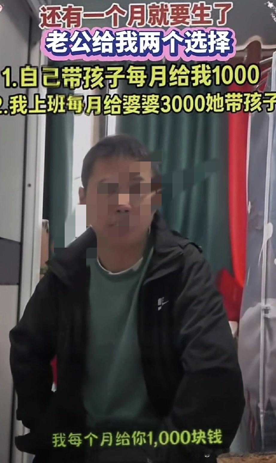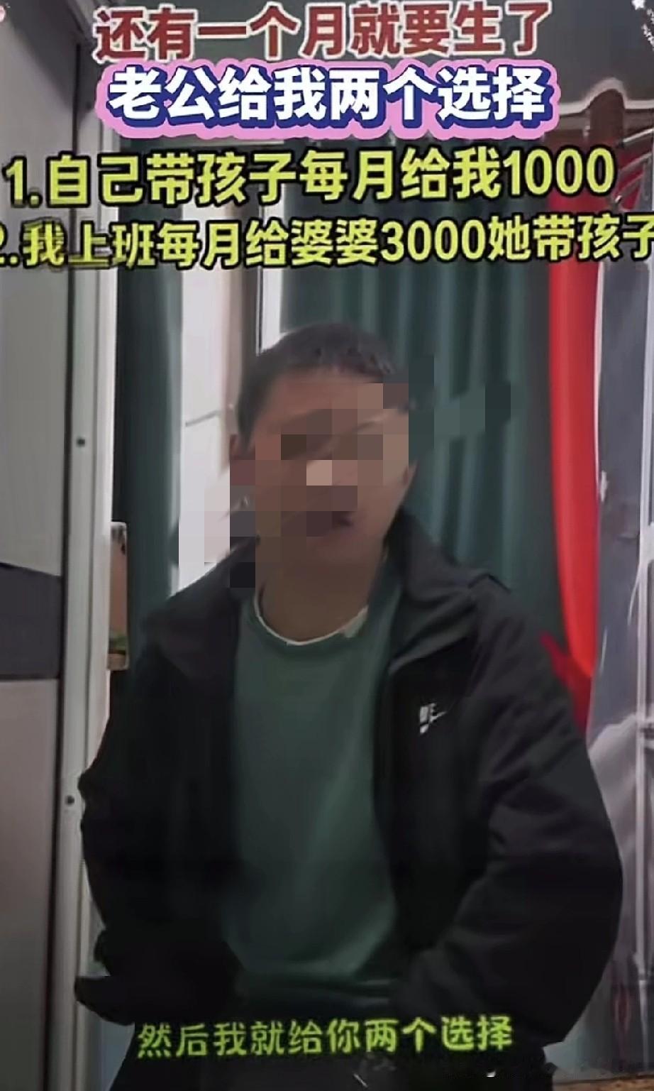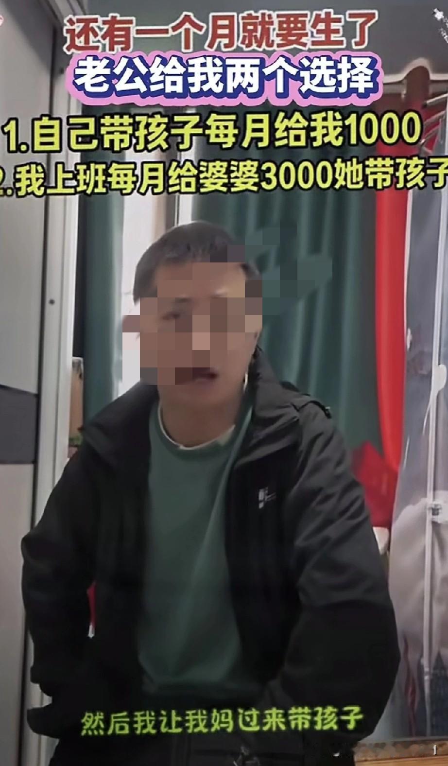男子的老婆还有一个月就要生产了。男子找老婆聊天,说:“你马上要生孩子了,我给你两个选择。第一个,你自己带孩子,我每个月给你1000块生活费;第二个,你出去上班,每个月给我妈3000块,让我妈过来带孩子。” 这是一个老公能说出来的话?真让人惊讶!为何老婆自己带孩子就只给1000块,婆婆帮忙带却要给3000块?实在让人想不通。赶紧及时止损吧,这样的男人不值得女人用余生去付出。真不知道这种男人哪来的自信,给他个选择,去父留子得了,太欺负人了,这还算男人吗?他居然能娶到老婆,更不可思议的是,这女人还愿意给他生孩子。 如今生育率低,都是被这种男人作的。孕妇马上就要生了,情绪本就焦虑,这个男人不说点好听的安慰一下也就罢了,还说这么扎心的话。合着这女人就是个生育工具,生完孩子身体和心理都不用时间恢复,直接就能满血复活去干活呗。养不起孩子就别娶老婆生孩子,这话真让人恶心。1000块钱能干什么?还搞区别对待。 结婚后,夫妻俩本应齐心协力经营小家,真心相待,而不是跟老婆耍心眼。这日子才刚开始,就奔着离婚去了吗?要是早知道要面临这样无奈的选择,请问,哪个女人还愿意生孩子?