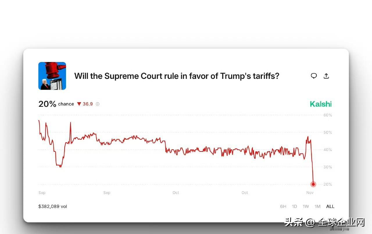 预测市场对美国最高院支持特朗普关税的预测概率迅速下降,目前交易反映出的数据仅有20%的可能最高院会支持特朗普关税。
