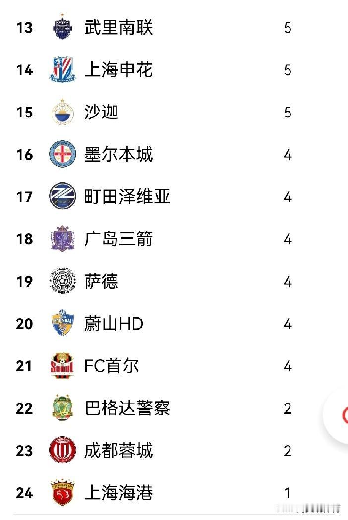 2025~2026赛季亚冠精英赛24强大排队(东亚+西亚) 上海申花位居第14,处中下游; 上海上港和成都蓉城排名垫底,名列第24和第23。