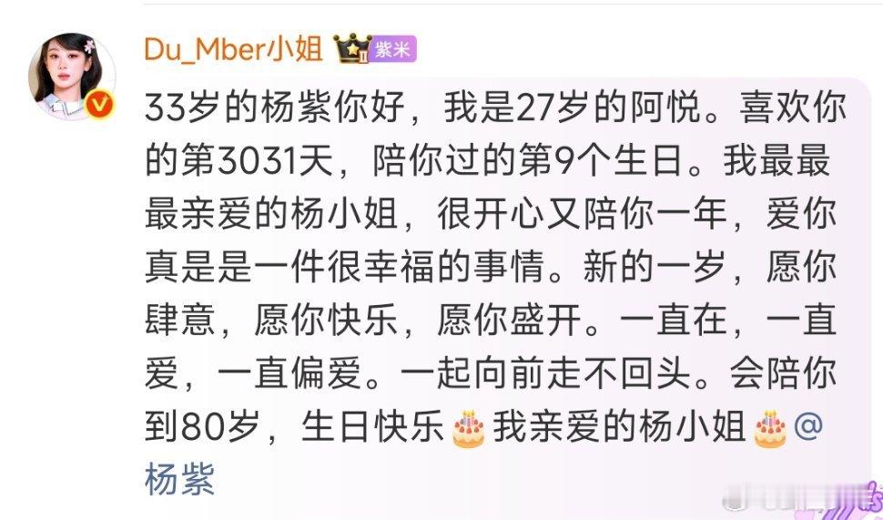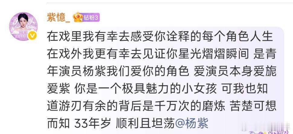 粉丝给杨紫的生日祝福粉丝给杨紫的33岁生日祝福 杨紫33岁生日如期而至!杨紫用何惟的灵动、董竹君的坚韧诠释热爱,戏里角色共情人心,戏外温柔真诚圈粉无数,双向奔赴的陪伴里满是岁月沉淀的美好,愿新岁平安顺遂,继续在热爱里发光!