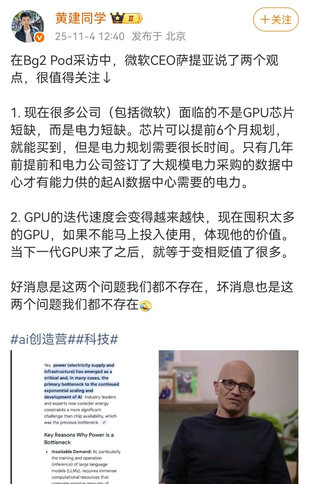 未雨绸缪,未来电力供应。 (图一)微软总裁谈目前两个大的短缺,芯片GPU通过快速迭代来解决,电力短缺必须要有长远的规划和长久的投资。 (图二)国内在新型核燃料堆的开发和应用取得很大的进步。 (图三)很多敏锐的投资者,开始大力投资电力等基础设施。