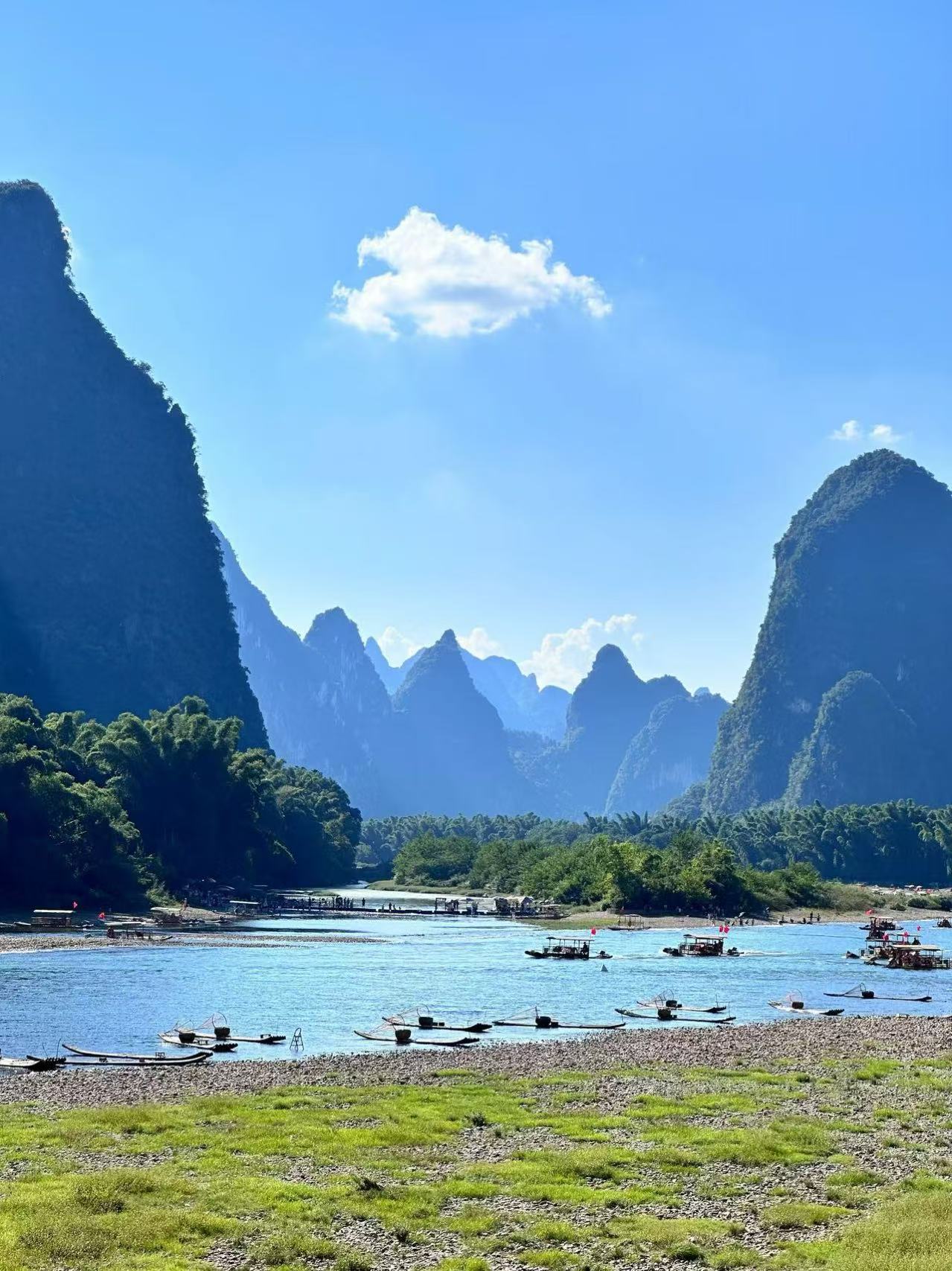 ✅漓江竹筏漂流:推荐兴坪朝板山码头至九马画山段,全程约1小时,可欣赏到黄布倒影等美景,感受“舟行碧波上,人在画中游”的意境。