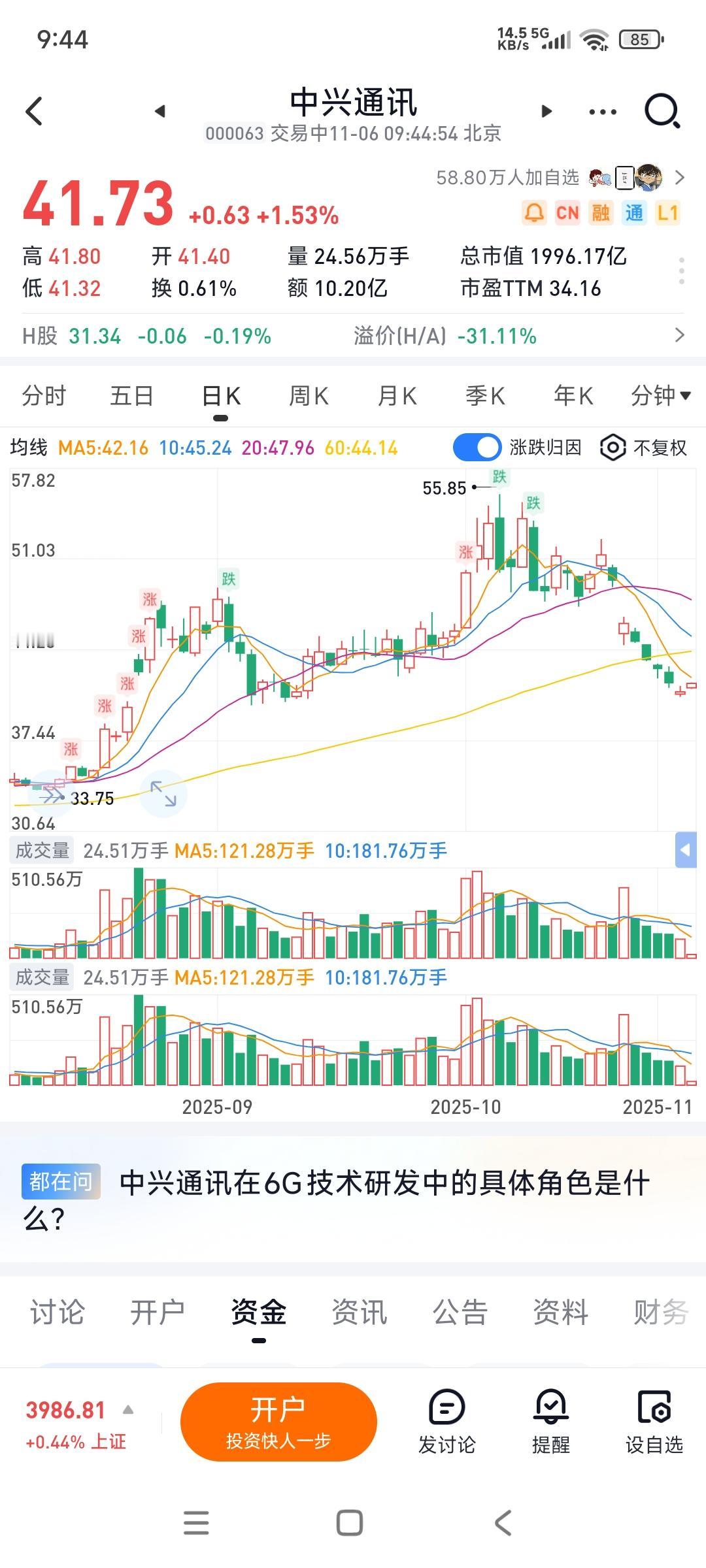 指数大涨,连续跌了七天,跌了20多个点的中兴通讯,今天早盘终于止跌上涨了,可这涨幅也仅仅跑赢了深成指,主力资金依旧呈现净流出... 弱反弹啊,唉...就看过几天的北京6G展会,会不会对它的股价有刺激... 其他方面可以说它是垃圾,但在6G的研发与布局方面,国内估计只有华为比它好的了...
