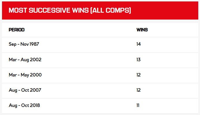 周二在布拉格的胜利意味着我们首次连续八场比赛未失一球,我们超越了格拉汉姆1987年率领的球队的壮举。在英格兰顶级联赛的历史上,只有另外两支球队取得过同样的零封胜场纪录,而且上一次出现这样的纪录已经超过一个世纪了(图1)。