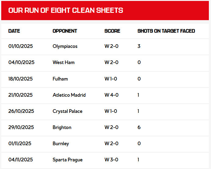 阿森纳官推更新一波零封/连胜纪录:周二在布拉格的胜利意味着我们首次连续八场比赛未