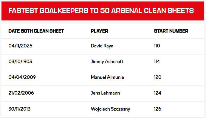 大卫-拉亚成为最快达到50场零封的阿森纳门将,只用了110场(图3)。
