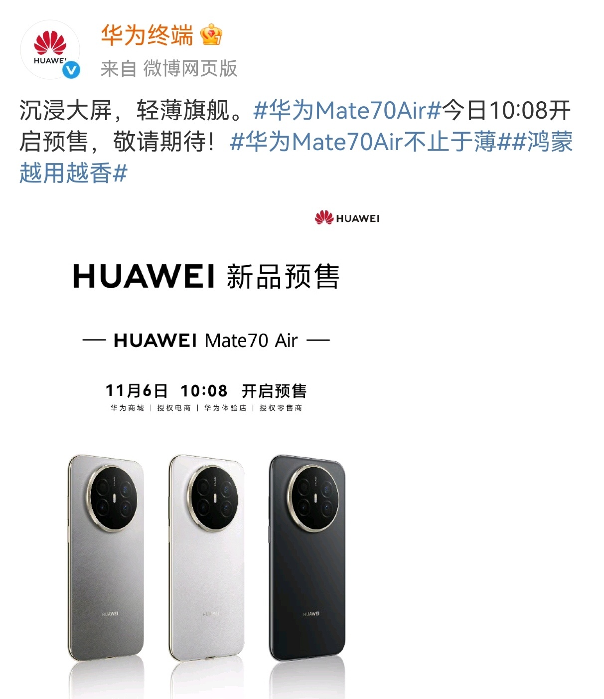 华为Mate70Air来了官方商城售价4199元,Mate70系列最便宜的一