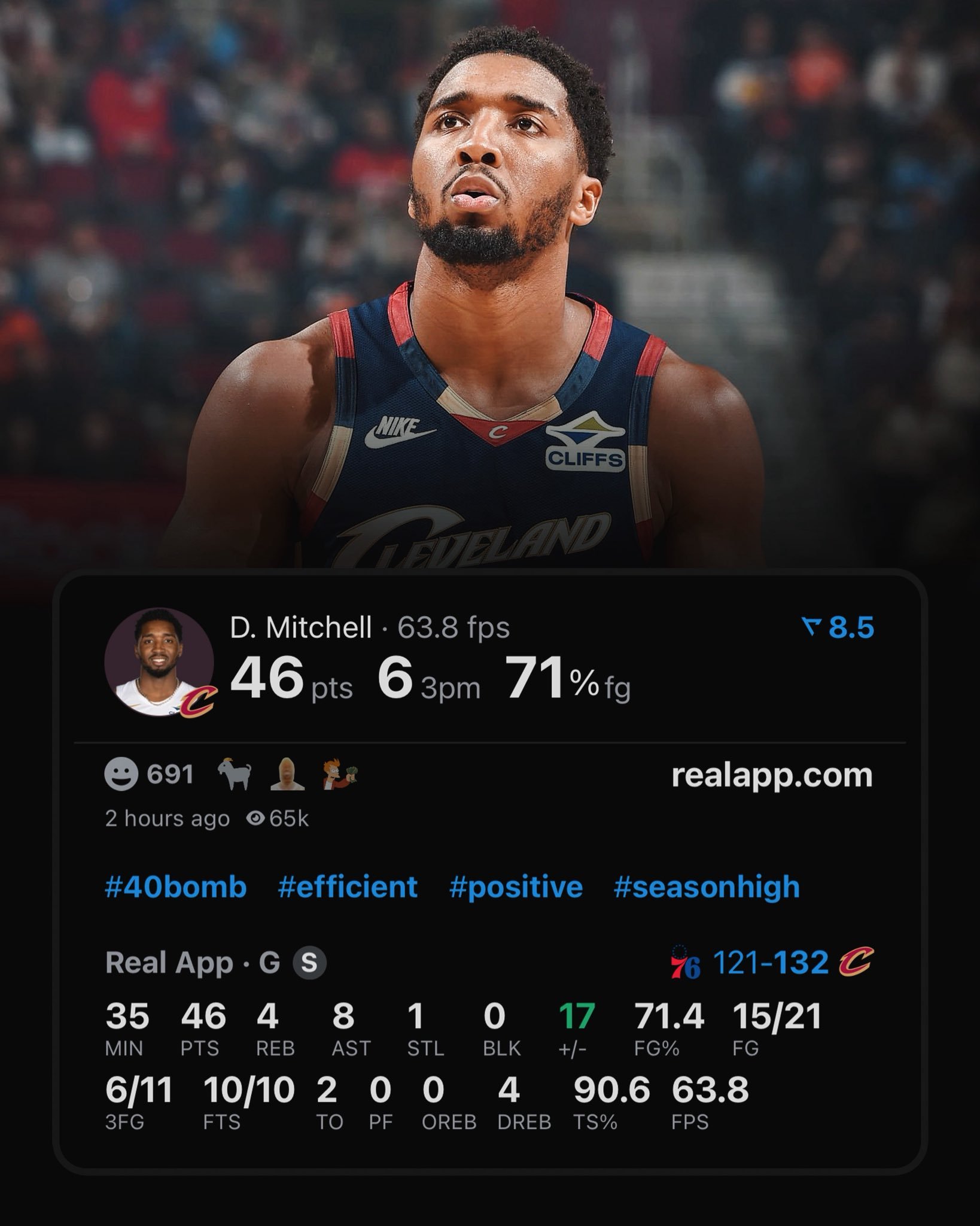 加兰复出之战,米切尔以90%的真实命中率拿到个人赛季第一个40+,赛季至今他以70%左右的真实命中率场均30+,得分表现很夸张。