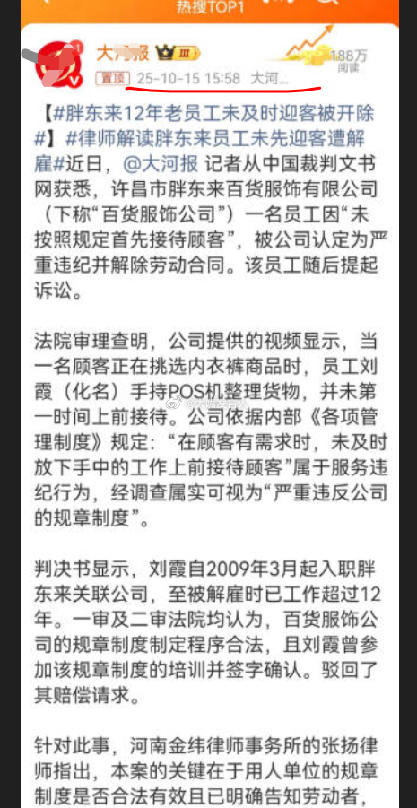 只是有件怪事,上次媒体报道,胖东来12年老员工未及时迎客被开除,媒体既未采访当事员工,也没有采访胖东来,而且更怪的是,最初报道这条新闻的媒体,在事后也让那条微博消失了[吐][吐]