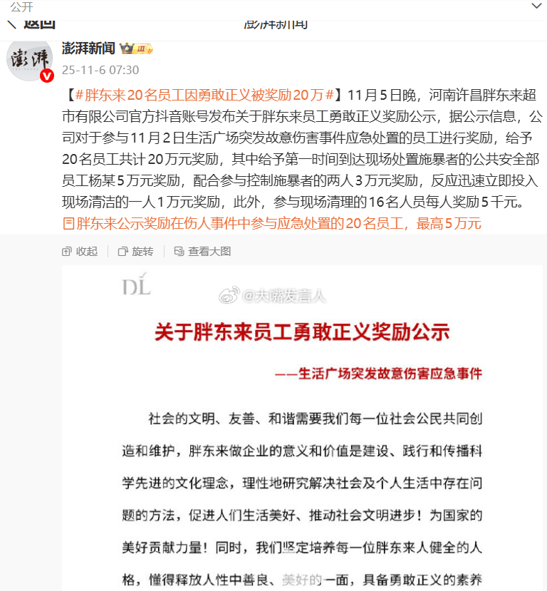 胖东来20名员工因勇敢正义被奖励20万 胖东来奖励见义勇为的员工共计20万元,加上平时对员工的关爱,于老板和公司的整体形象是不错的[赞][赞]