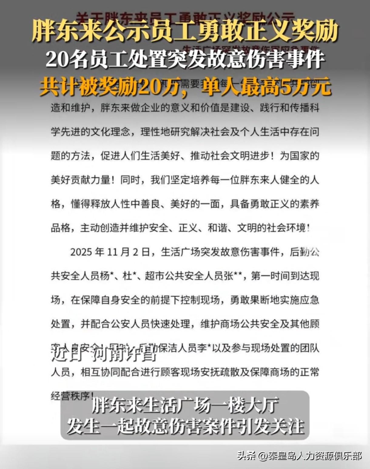 胖东来20万重奖了20名在伤人事件中表现勇敢的员工! 胖东来这事做得真漂亮!这事发生在11月2日许昌胖东来生活广场,当时有歹徒行凶伤人,商场工作人员临危不乱,第一时间控制住现场,避免了事态扩大。 特别值得一提的是公共安全部的杨某,他第一个冲到现场制止施暴者,公司重奖他5万元!配合参与控制的杜某和张某某也各得3万元。就连迅速投入现场清洁的保洁人员李某也获得了1万元奖励,还有其他16名参与处置的员工每人拿到5000元。 要我说,胖东来这种慷慨奖励见义勇为的行为,在当今企业里真是不多见。他们在保障自身安全的前提下,鼓励员工勇敢正义,这种管理智慧值得点赞。不仅让员工感受到温暖,也让社会看到了正能量。这样的企业氛围,才能真正激发员工的责任感和归属感。希望更多企业能像胖东来这样,用实实在在的奖励培养员工的正义感,让社会更加文明和谐!