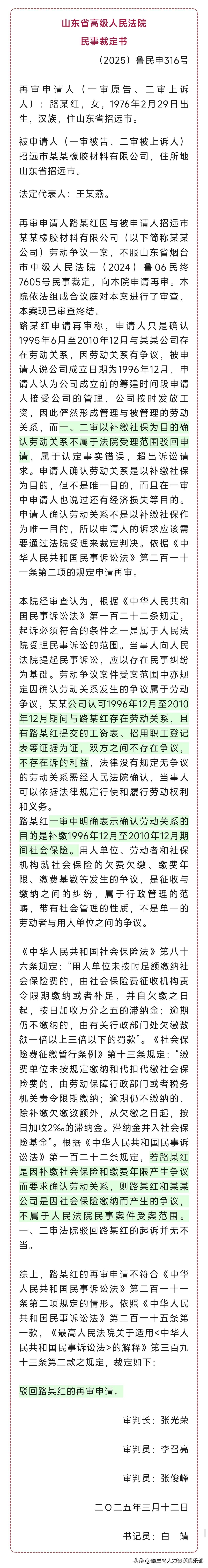 山东高院最新裁定:为补缴社保打确认劳动关系的官司,法院不受理!背后原因职场人必知 最近有个案子挺有代表性:路大姐从1995年就在一家公司工作,直到2010年离职,发现公司没给她缴满社保。她要求补缴,公司只认可1996年12月(公司正式成立)之后的劳动关系。路大姐只好告到法院,要求确认整个工作期间的劳动关系。 但三级法院(一审、二审、高院)统统驳回了她的起诉!为啥?山东高院在2025年3月的裁定中说透了关键: 1. 法院只处理“真纠纷”,不解决“无争议”的事公司已经承认1996年之后的劳动关系,工资表、登记表等证据齐全,双方对这期间没争议。法院认为,没有纠纷的劳动关系,不需要司法确认,劳动者直接拿证据去办社保补缴就行。 2. 补缴社保是行政事务,不归民事法庭管路大姐明确说,确认劳动关系就是为了补缴社保。但社保欠缴、缴费年限等问题,属于社保征收机构管的事儿。法律明确规定,用人单位不缴社保的,由社保征收机构责令补缴加收滞纳金,甚至罚款。这类争议带行政管理性质,不是普通的劳资纠纷。 这事儿给职场人提了个醒: - 如果单位承认劳动关系,只是不缴社保,别盲目起诉确认劳动关系!直接向社保部门或劳动监察投诉更高效。 - 如果单位不承认劳动关系,这才需要先走仲裁或诉讼确认关系,但诉求别只盯着“为了补缴社保”,可结合经济赔偿等一并主张。 说白了,司法资源和行政职权各有边界,维权得找对门路!不然耗时耗力,还容易被驳回。 “涨知识了!原来法院不是万能的,社保事得找社保局!” “企业为啥敢不缴社保?就是赌劳动者不懂这些程序!” (参考案例:山东省高级法院(2025)鲁民申316号裁定)
