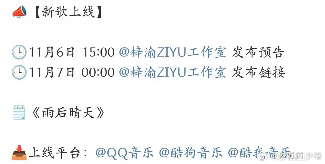 梓渝新歌雨后晴天,今天下午15点,关注梓渝工作室!晚上零点各平台上线