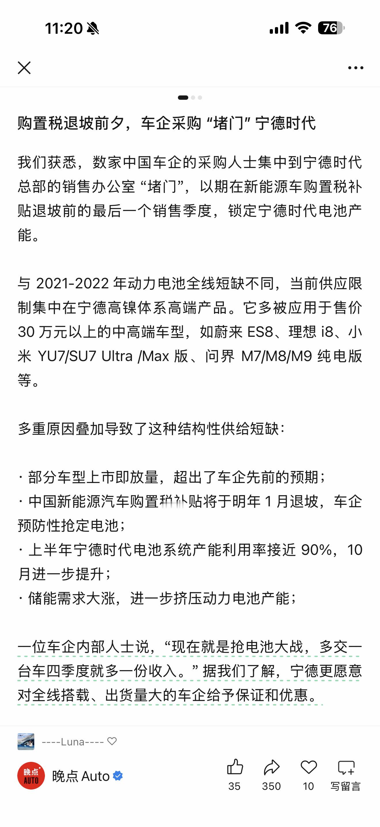 《晚点AUTO》:车企采购堵门宁德时代