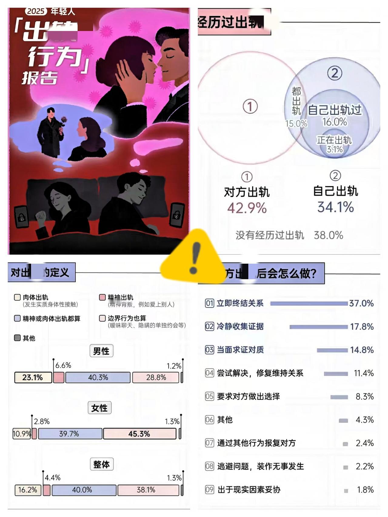 硕士博士出gui率34.2% 竟是高中学历的两倍? 这份报告真的颠覆认知,别忙着骂“读书多没德行”,背后的真相更戳亲密关系的痛点! 高学历者圈子广、诱惑多是事实,但更关键的是他们敢承认“精神越界”这种模糊地带! 最扎心的是,很多人出gui后还爱着原配,却选择隐瞒,不是不想负责,是不敢面对代价。但感情里最致命的从不是出gui本身,是信任碎了之后,再难重建对未来的期待! 你觉得肉体出轨和精神越界,哪个更不能忍?如果发现对方背叛,你会选择原谅还是转身离开?