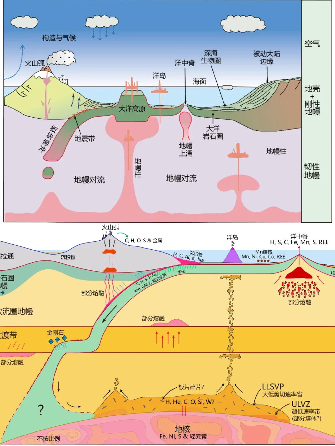 [一R]固体地球系统由地球内部的地壳、地幔和地核三大圈层构成, 它们之间在能量和物质上的交换不仅涉及固态圈层之间, 而且涉及地球内部与外部. 这种跨圈层相互作用主要通过刚性板块俯冲、对流地幔上涌等构造过程, 引发地震、滑坡、火山等灾害, 实现地球系统之间在物质和能量上的交换, 进而改变地表形态, 影响大气圈、水圈、生物圈和土壤圈的循环, 并引发地震、滑坡、火山等自然灾害.