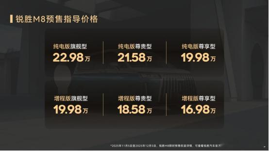 作为北汽制造旗下的独立品牌,锐胜M8在昨日开启预售,纯电版19.98万起,增程版16.98万起。