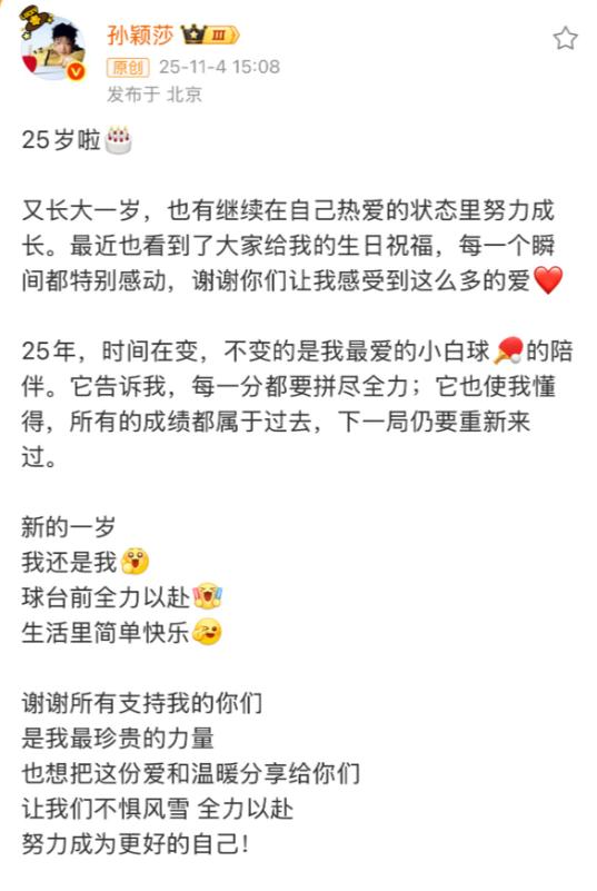 这下好了。 全国的粉丝都被她惹哭了。 孙颖莎发微博说—— 最近也看到了大家给我的生日祝福, 每一个瞬间都特别感动! 原来我们所有的爱,她都看在眼里,记在心底。这份被珍视、被回应的懂得,瞬间击中了所有人——她什么都知道。 读着莎莎的字句,心底最柔软的地方被触动了。我们倾注的爱,她不仅全部看见,更用一颗赤诚之心给予了最温柔的回应。祝莎莎生日快乐,愿这份美好,护佑她前行之路永远明亮。 莎莎回复大家的问候太温馨了,好感动,莎莎是个懂事的孩子,不用豪言壮语,用最暖心的话,最坚强的实力告诉大家。她很好,会继续努力。莎莎爱你! 孙颖莎睿智、乖巧、沉稳、善良、机灵、纯洁、仁义、真诚……人见人爱! 赛场与生活的反差美,引人入胜! 字里行间体现了分寸感,呈现了亲和力,既温暖,又有力量!值得所有人的喜欢! 这孩子就是善良,没有华丽的词语,但句句都是那么贴心,都是那么低调,所以我们爱他,祝他年年快乐,身体健康,最后取得好的成绩,在我们的心里,冠军,亚军已经不重要了,我们是喜欢这个健康快乐阳光的莎莎!