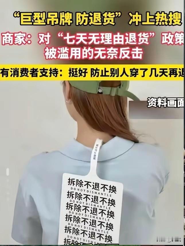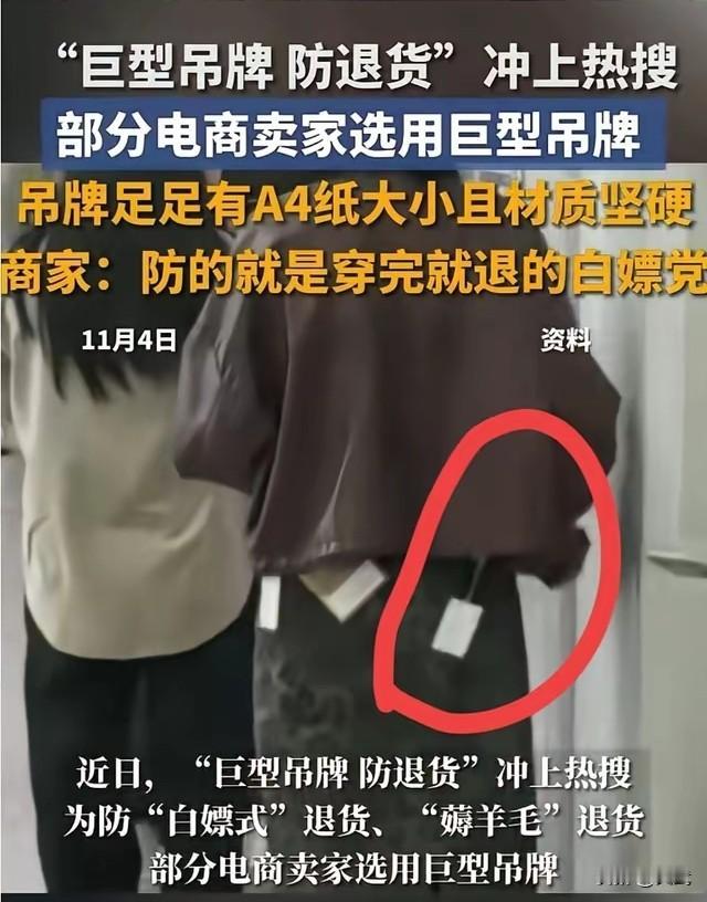 吊牌“巨无霸”:电商江湖的无奈反击 当网购的快递盒里,吊牌比衣服还大,这并非商家审美跑偏,而是被“七天无理由”玩坏的商业生态,逼出的“笨办法”。 七天无理由,成了白嫖党的“免死金牌” 本是保障消费者的退货政策,却被钻了空子。有人专挑高单价衣服买,穿去相亲、赴宴、拍完朋友圈,潇洒一句“不合适”就退回,一分钱不花,还赚足排面。商家苦不堪言,退货运费、商品损耗,全成了白嫖党的“嫁衣”。 眼看规则漏洞被钻烂,商家祭出“物理防御”:把吊牌尺寸从巴掌大升级到A4纸大小,硬质卡纸印刷“穿着后请勿拆除”,拆起来比拆快递还费劲。更绝的,有商家在吊牌背面印“检测到穿着痕迹将启动司法程序”,虽无法律效力,但成功吓退不少退货党。还有的植入NFC芯片,扫码显示“已激活防伪系统”,实则跳转官网,这招让退货率降了不少。 平台将“退货率超40%”的商家列入黑名单,白嫖党转头就盯上低价商品。某童装店主发现,同一批买家开始买29.9元的打底裤,穿脏后以“质量问题”发起仅退款,单日损失超五千。更荒诞的是,有人专门卖“防退吊牌”教程,教商家用订书机把吊牌缝死,结果服装厂订书机销量暴涨300%。 这场魔幻攻防战里,仍有商家在破局:有推出“试穿险”,付5元可三次免费试穿,退货免运费;有开发可降解吊牌,承诺“穿着后自然降解返20元”;更有人气主播发起“七天无理由2.0”投票,超八成网友支持“退货需付清洁费”。 当吊牌从商品标识沦为道德审判的标尺,这场战争早已超越商业范畴。它折射出数字时代信任体系的脆弱,更暴露出规则漏洞被异化的荒诞。或许,正如某店主所言:“我们不是要为难消费者,只是不想让善意成为别人薅羊毛的工具。”
