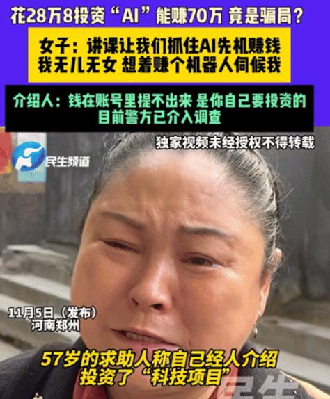 天上哪会掉馅饼!河南郑州,57大妈无儿无女,竟然卖掉黄金,卖掉首饰,用全部积蓄盲目跟风投资”AI”,结果血本无归。 我曾经被别人忽悠过,让我投资二万元做个像是传销生意,说能翻几十万,我告诉他暂时没钱,让他替我出,赚钱了平分,他一听不搭理我了。 我今年63岁,我的钱都存银行定期,谁也别想骗走我的钱,每个月就花我的退休金,老了有大病需要用大钱时再动存款。 骗子专找无知,贪利的人下手,所以呢,被骗人往往是血本无归,天上不会掉馅饼,特别是,年老人,切莫听骗子的花言巧语,丢掉了养老本钱!悔之晚矣!