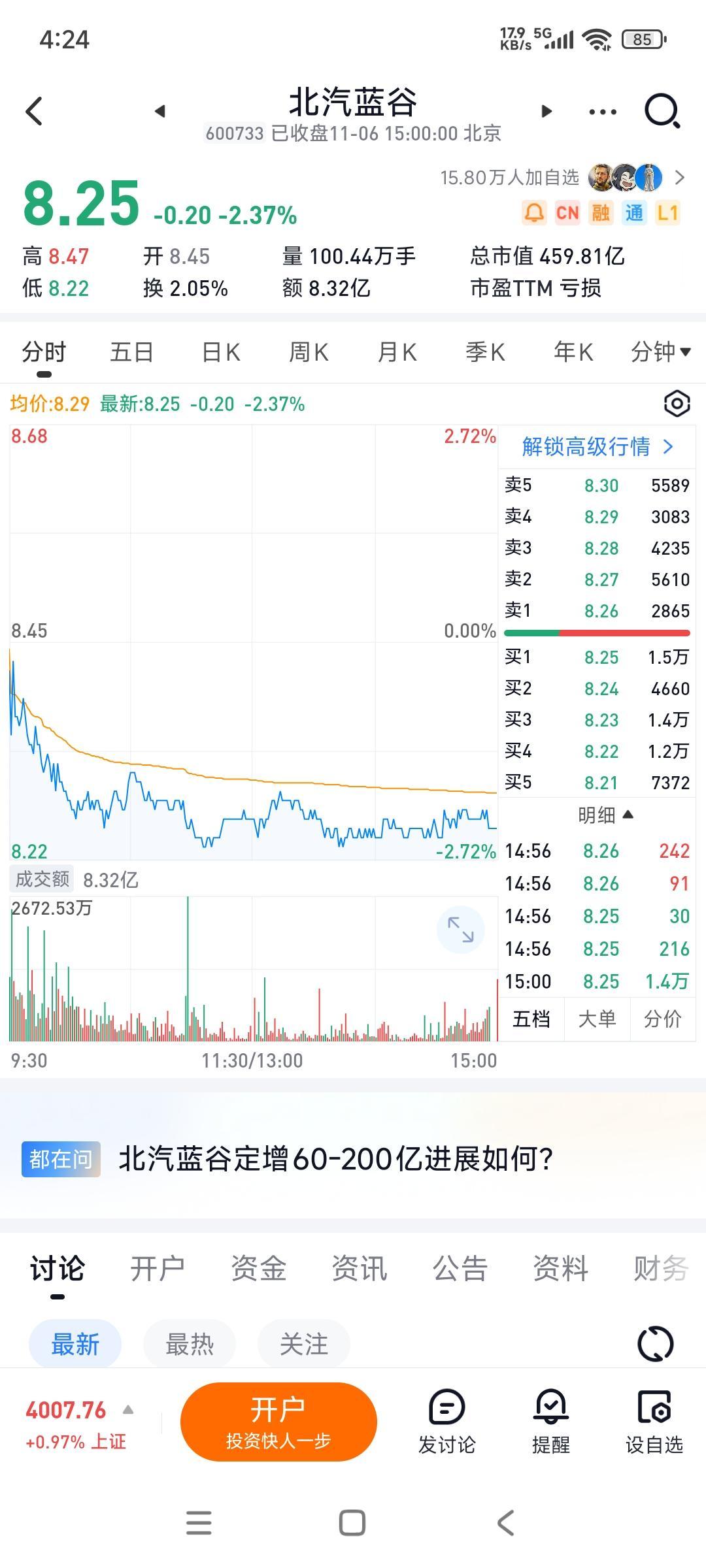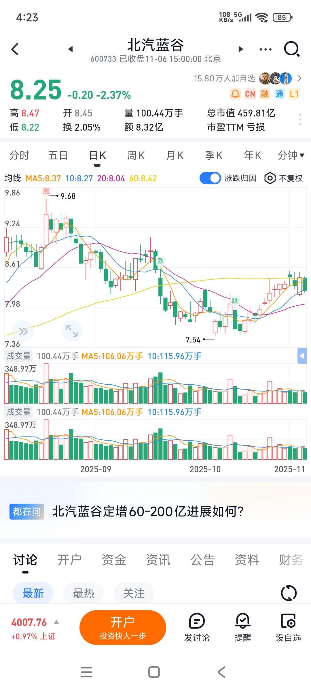 今天的持仓股中就北汽蓝谷下跌,跌幅还不小,我还指望它今年剩余两个月与明年赚大钱呢... 其实,每次享界新品发布上市,北汽蓝谷的股价都要下跌,之前的S9T发布后,股价从9块多,一路下跌到7.5上下,足跌了二十个点...下跌过程中,我陆续加仓了60手... 这次新款享界S9又要发布上市了,若再跌到8块以内,就再加仓30手,每跌5毛,加仓30手... 还是那句话,没到10块,不考虑减仓...[捂脸]