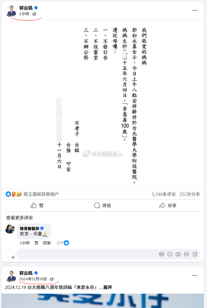 对岸郭董,罕见网络发言,通告母亲百岁离世。