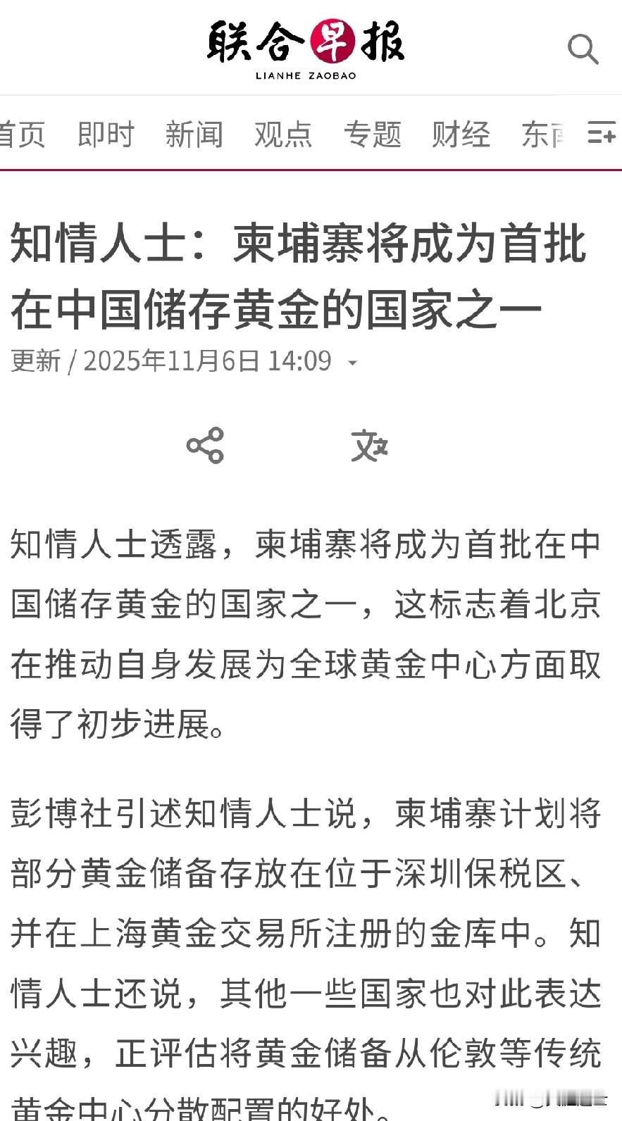 据新加坡联合早报报道,柬埔寨将向我国储存黄金,这标志着我国在推动自身发展成全世界黄金储备中心方面取得了重大进展,据悉可能还有其他国家也有这个意愿和计划。 根据世界黄金协会的最新评估,柬埔寨央行持有约54吨黄金,占柬埔寨260亿美元(339.45亿新元)外汇储备的四分之一。柬埔寨方面计划将黄金存储存放在上海黄金交易所注册的金库和深圳保税区中,据悉还有一些国家也计划从伦敦等传统黄金储备地转移向我国。
