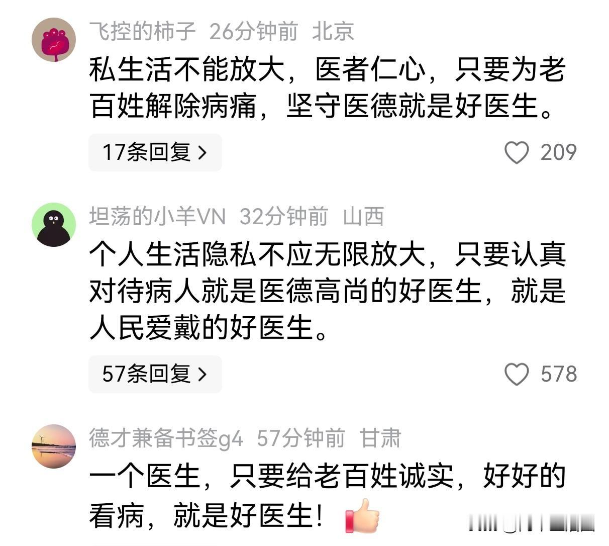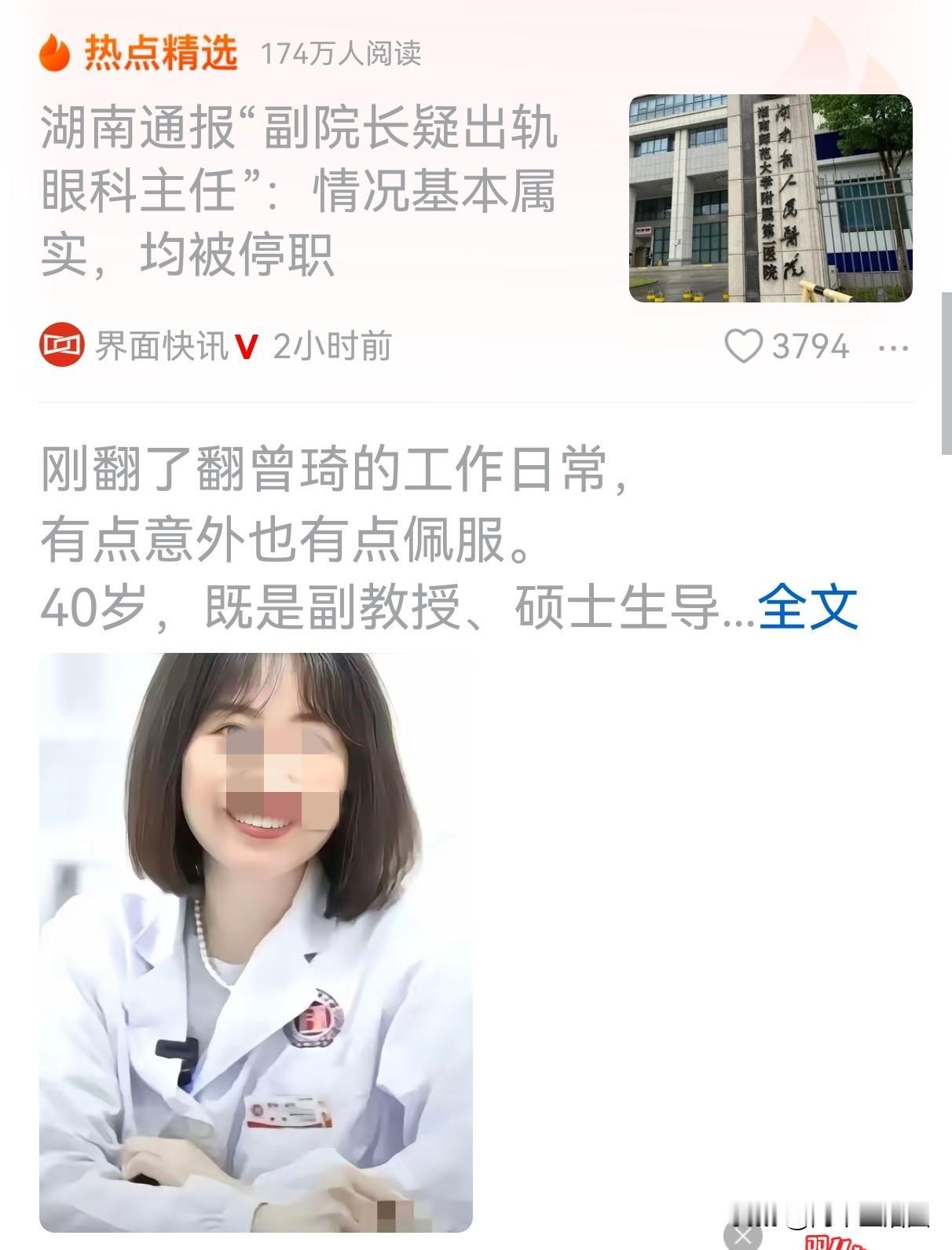 湖南人民医院通报还是来了, 两个人的情况基本属实,均被停职。 说实话,这样的处分不可谓不重。两个人都是医院的顶梁柱,尤其是年轻的女眼科副主任,40岁就是副教授,肯定付出了很多辛苦。 看看评论区,清一色都是为两人叫屈的,大家的意见基本上都是“私生活不能放大,只要认真对待病人就是好医生”。 这活说的有一定道理,但是两个人擦出爱情火花没有错,关键不应该选择在医院内。这是作为医生最起码的准则,私德有亏,就不能算好医生。 要不我们为什么一直提倡什么“医德”“师德”,这德那德。德,不仅仅是行业内的道德,更包括最基本的社会道德。 大家对此,有何看法,他们两个冤不冤?